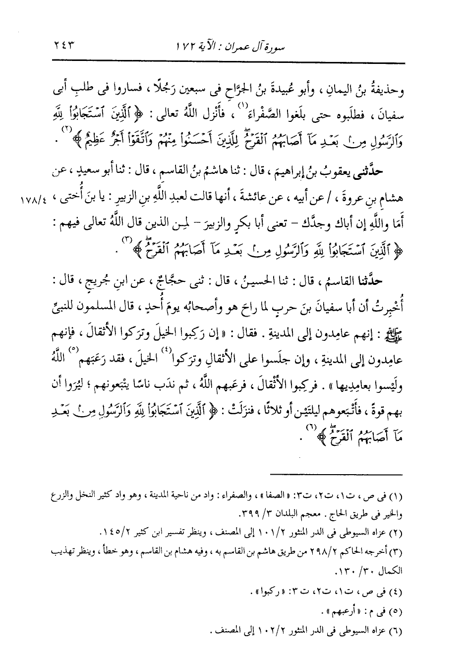 حَدَّثَنَا الْقَاسِمُ، قَالَ: ثنا الْحُسَيْنُ، قَالَ: ثني حَجَّاجٌ، عَنِ ابْنِ جُرَيْجٍ، قَالَ: " أُخْبِرْتُ أَنَّ أَبَا سُفْيَانَ بْنَ حَرْبٍ لَمَّا رَاحَ هُوَ وَأَصْحَابُهُ يَوْمَ أُحُدٍ قَالَ الْمُسْلِمُونَ لِلنَّبِيِّ صَلَّى اللهُ عَلَيْهِ وَسَلَّمَ: إِنَّهُمْ عَامِدُونَ إِلَى الْمَدِينَةِ، فَقَالَ: «§إِنْ رَكِبُوا الْخَيْلَ وَتَرَكُوا الْأَثْقَالَ فَإِنَّهُمْ عَامِدُونَ إِلَى الْمَدِينَةِ، وَإِنْ جَلَسُوا عَلَى الْأَثْقَالِ وَتَرَكُوا الْخَيْلَ فَقَدْ أَرْعَبَهُمُ اللَّهُ وَلَيْسُوا بِعَامِدِيهَا» ، فَرَكَّبُوا الْأَثْقَالَ، فَرَعَبَهُمُ اللَّهُ، ثُمَّ نَدَبَ نَاسًا يَتْبَعَونَهُمْ لِيَرَوْا أَنَّ بِهِمْ قُوَّةً، فَاتَّبَعِوهُمْ لَيْلَتَيْنِ أَوْ ثَلَاثًا، فَنَزَلَتْ: {الَّذِينَ اسْتَجَابُوا لِلَّهِ وَالرَّسُولِ مِنْ بَعْدِ مَا أَصَابَهُمُ الْقَرْحُ} [آل عمران: 172]