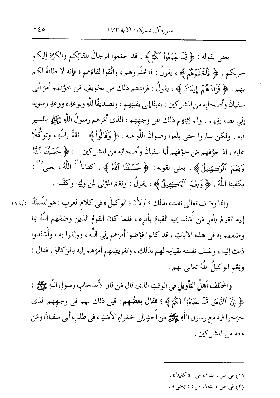 يَعْنِي بِقَوْلِهِ: {قَدْ جَمَعُوا لَكُمْ} [آل عمران: 173] قَدْ جَمَعُوا الرِّجَالَ لِلِقْائِكُمْ، وَالْكَرَّةِ إِلَيْكُمْ لِحَرْبِكُمْ {فَاخْشَوْهُمْ} [آل عمران: 173] يَقُولُ: فَاحْذَرُوهُمْ، وَاتَّقُوا لِقَاءَهُمْ، فَإِنَّهُ لَا طَاقَةَ لَكُمْ بِهِمْ، {فَزَادَهُمْ إِيمَانًا} [آل عمران: 173] يَقُولُ: فَزَادَهُمْ ذَلِكَ مِنْ تَخْوِيفِ مَنْ خَوَّفَهُمْ أَمْرُ أَبِي سُفْيَانَ وَأَصْحَابِهِ مِنَ الْمُشْرِكِينَ يَقِينًا إِلَى يَقِينِهِمْ، وَتَصْدِيقًا لِلَّهِ وَلِوَعْدِهِ وَوَعْدِ رَسُولِهِ إِلَى تَصْدِيقِهِمْ، وَلَمْ يُثْنِهِمْ ذَلِكَ عَنْ وَجْهِهِمُ الَّذِي أَمَرَهُمْ رَسُولُ اللَّهِ صَلَّى اللهُ عَلَيْهِ وَسَلَّمَ بِالسَّيْرِ فِيهِ، وَلَكِنْ سَارُوا حَتَّى بَلَغُوا رِضْوَانَ اللَّهِ مِنْهُ، وَقَالُوا ثِقَةً بِاللَّهِ، وَتَوَكُّلًا عَلَيْهِ، إِذْ خَوَّفَهُمْ مَنْ خَوَّفَهُمْ أَبَا سُفْيَانَ وَأَصْحَابَهُ مِنَ الْمُشْرِكِينَ {حَسْبُنَا اللَّهُ وَنِعْمَ الْوَكِيلُ} [آل عمران: 173] يَعْنِي بِقَوْلِهِ: حَسْبُنَا اللَّهُ: كَفَانَا اللَّهُ، يَعْنِي: يَكْفِينَا اللَّهُ؛ وَنِعْمَ الْوَكِيلُ، يَقُولُ: وَنِعْمَ الْمَوْلَى لِمَنْ وَلِيَهُ وَكَفَلَهُ؛ وَإِنَّمَا وَصَفَ تَعَالَى نَفْسَهُ بِذَلِكَ؛ لِأَنَّ الْوَكِيلَ فِي كَلَامِ الْعَرَبِ: هُوَ الْمُسْنَدُ إِلَيْهِ الْقِيَامُ بِأَمْرِ مَنْ أَسْنَدَ إِلَيْهِ الْقِيَامَ بِأَمْرِهِ؛ فَلَمَّا كَانَ الْقَوْمُ الَّذِينَ وَصَفَهُمُ اللَّهُ بِمَا وَصَفَهُمْ بِهِ فِي هَذِهِ الْآيَاتِ قَدْ كَانُوا فَوَّضُوا أَمْرَهُمْ إِلَى اللَّهِ، وَوَثِقُوا بِهِ، وَأَسْنَدُوا ذَلِكَ إِلَيْهِ وَصَفَ نَفْسَهُ بِقِيَامِهِ لَهُمْ بِذَلِكَ، وَتَفْوِيضِهِمْ أَمْرَهُمْ إِلَيْهِ بِالْوِكَالَةِ، فَقَالَ: وَنِعْمَ الْوَكِيلُ اللَّهُ تَعَالَى لَهُمْ. وَاخْتَلَفَ أَهْلُ التَّأْوِيلِ فِي الْوَقْتِ الَّذِي قَالَ مَنْ قَالَ لِأَصْحَابِ رَسُولِ اللَّهِ صَلَّى اللهُ عَلَيْهِ وَسَلَّمَ: {إِنَّ النَّاسَ قَدْ جَمَعُوا لَكُمْ} [آل عمران: 173] فَقَالَ بَعْضُهُمْ: قِيلَ ذَلِكَ لَهُمْ فِي وَجْهِهِمُ الَّذِي خَرَجُوا فِيهِ مَعَ رَسُولِ اللَّهِ صَلَّى اللهُ عَلَيْهِ وَسَلَّمَ مِنْ أُحُدٍ إِلَى حَمْرَاءِ الْأَسَدِ فِي طَلَبِ أَبِي سُفْيَانَ وَمَنْ مَعَهُ مِنَ الْمُشْرِكِينَ