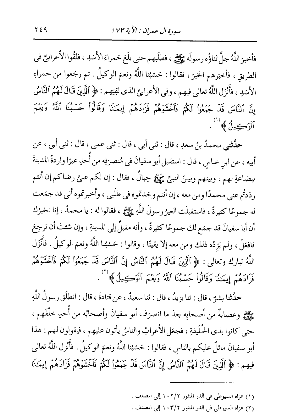 حَدَّثَنَا بِشْرٌ، قَالَ: ثنا يَزِيدُ، قَالَ: ثنا سَعِيدٌ، عَنْ قَتَادَةَ، قَالَ: " انْطَلَقَ رَسُولُ اللَّهِ صَلَّى اللهُ عَلَيْهِ وَسَلَّمَ وَعِصَابَةٌ مِنْ أَصْحَابِهِ بَعْدَمَا انْصَرَفَ أَبُو سُفْيَانَ وَأَصْحَابُهُ مِنْ أُحُدٍ خَلْفَهُمْ، حَتَّى كَانُوا بِذِي الْحُلَيْفَةِ، فَجَعَلَ الْأَعْرَابُ وَالنَّاسُ يَأْتُونَ عَلَيْهِمْ، فَيَقُولُونَ لَهُمْ: هَذَا أَبُو سُفْيَانَ مَائِلٌ عَلَيْكُمْ بِالنَّاسِ، فَقَالُوا: {§حَسْبُنَا اللَّهُ وَنِعْمَ الْوَكِيلُ} [آل عمران: 173] ، فَأَنْزَلَ اللَّهُ تَعَالَى فِيهِمْ: {الَّذِينَ قَالَ لَهُمُ النَّاسُ إِنَّ النَّاسَ قَدْ جَمَعُوا لَكُمْ فَاخْشَوْهُمْ فَزَادَهُمْ إِيمَانًا -[250]- وَقَالُوا حَسْبُنَا اللَّهُ وَنِعْمَ الْوَكِيلُ} [آل عمران: 173] وَقَالَ آخَرُونَ: بَلْ قَالَ ذَلِكَ لِرَسُولِ اللَّهِ صَلَّى اللهُ عَلَيْهِ وَسَلَّمَ وَأَصْحَابِهِ مَنْ قَالَ ذَلِكَ لَهُ فِي غَزْوَةِ بَدْرٍ الصُّغْرَى وَذَلِكَ فِي مَسِيرِ النَّبِيِّ صَلَّى اللهُ عَلَيْهِ وَسَلَّمَ عَامَ قَابِلٍ مِنْ وَقْعَةِ أُحُدٍ لِلِقَاءِ عَدُوِّهِ أَبِي سُفْيَانَ وَأَصْحَابِهِ لِلْمَوْعِدِ الَّذِي كَانَ وَاعَدَهُ الِالْتِقَاءَ بِهَا