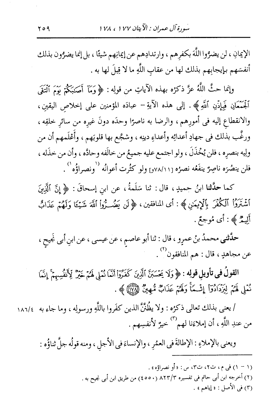 §الْقَوْلُ فِي تَأْوِيلِ قَوْلِهِ تَعَالَى: {وَلَا يَحْسَبَنَّ الَّذِينَ كَفَرُوا أَنَّمَا نُمْلِي لَهُمْ خَيْرٌ لِأَنْفُسِهِمْ إِنَّمَا نُمْلِي لَهُمْ لِيَزْدَادُوا إِثْمًا وَلَهُمْ عَذَابٌ مُهِينٌ} [آل عمران: 178] يَعْنِي بِذَلِكَ تَعَالَى ذِكْرُهُ: وَلَا يَظُنَّنَّ الَّذِينَ كَفَرُوا بِاللَّهِ وَرَسُولِهِ، وَمَا جَاءَ بِهِ مِنْ عِنْدِ اللَّهِ أَنَّ إِمْلَاءَنَا لَهُمْ خَيْرٌ لِأَنْفُسِهِمْ. وَيَعْنِي بِالْإِمْلَاءِ: الْإِطَالَةَ فِي الْعُمُرِ وَالْإِنْسَاءَ فِي الْأَجَلِ؛ وَمِنْهُ قَوْلُهُ جَلَّ ثناؤُهُ