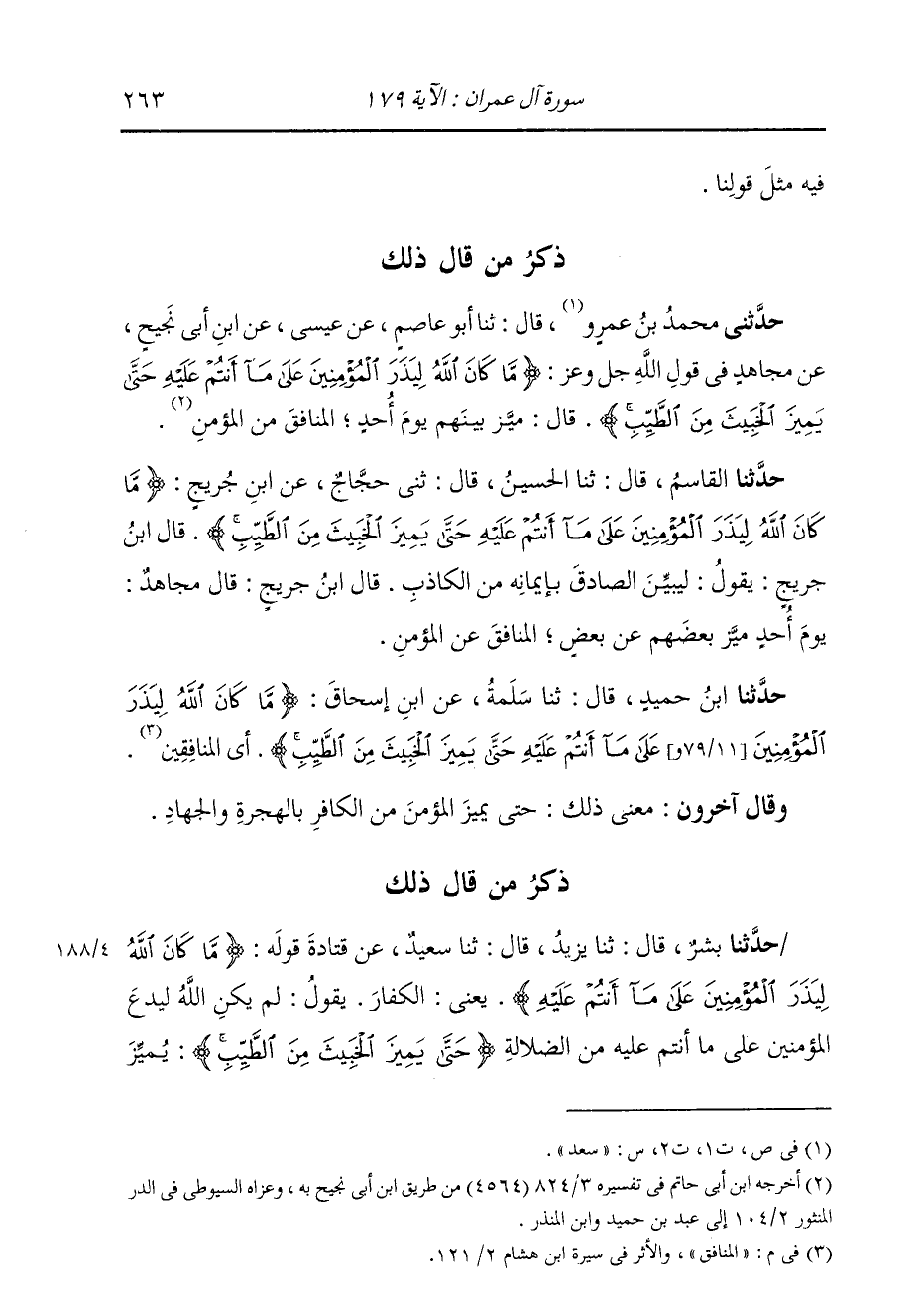 حَدَّثَنَا ابْنُ حُمَيْدٍ، قَالَ: ثنا سَلَمَةُ، عَنِ ابْنِ إِسْحَاقَ: {§مَا كَانَ اللَّهُ لِيَذَرَ الْمُؤْمِنِينَ عَلَى مَا أَنْتُمْ عَلَيْهِ حَتَّى يَمِيزَ الْخَبِيثَ مِنَ الطَّيِّبِ} [آل عمران: 179] «أَيِ الْمُنَافِقَ» وَقَالَ آخَرُونَ: مَعْنَى ذَلِكَ: حَتَّى يُمَيِّزَ الْمُؤْمِنَ مِنَ الْكَافِرِ بِالْهِجْرَةِ وَالْجِهَادِ
