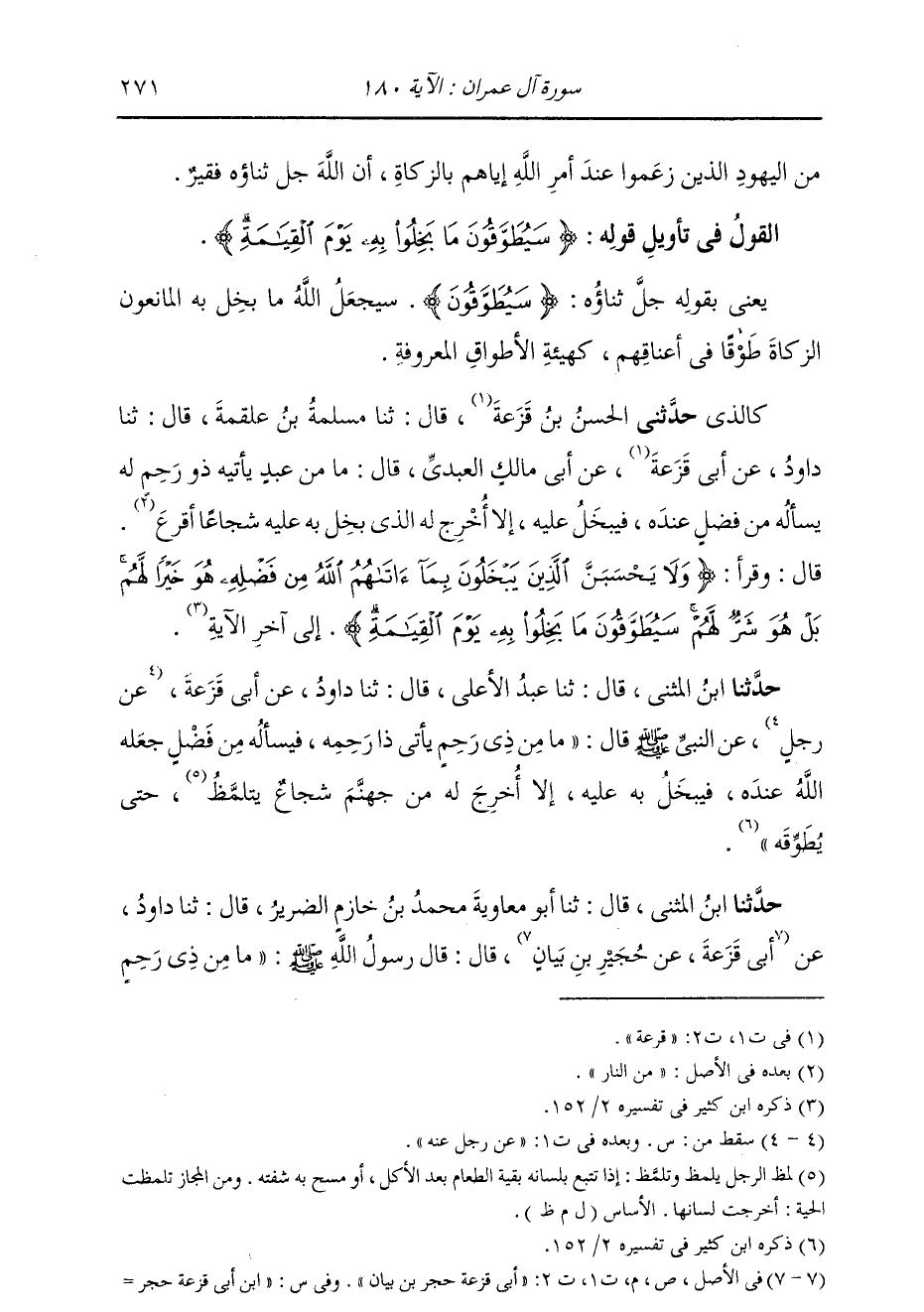 حَدَّثَنَا ابْنُ الْمُثَنَّى، قَالَ: ثنا أَبُو مُعَاوِيَةَ مُحَمَّدُ بْنُ خَازِمٍ، قَالَ: ثنا دَاوُدُ، عَنْ أَبِي قَزَعَةَ حُجْرِ بْنِ بَيَانٍ، قَالَ: قَالَ رَسُولُ اللَّهِ صَلَّى اللهُ عَلَيْهِ وَسَلَّمَ: «مَا مِنْ ذِي رَحِمٍ -[272]- يَأْتِي ذَا رَحِمِهِ فَيَسْأَلُهُ مِنْ فَضْلٍ أَعْطَاهُ اللَّهُ إِيَّاهُ فَيَبْخَلُ بِهِ عَلَيْهِ، §إِلَّا أُخْرِجَ لَهُ يَوْمَ الْقِيَامَةِ شُجَاعٌ مِنَ النَّارِ يَتَلَمَّظُ حَتَّى يُطَوَّقُهُ» ثُمَّ قَرَأَ: {وَلَا يَحْسَبَنَّ الَّذِينَ يَبْخَلُونَ بِمَا آتَاهُمُ اللَّهُ مِنْ فَضْلِهِ} [آل عمران: 180] حَتَّى انْتَهَى إِلَى قَوْلِهِ: {سَيُطَوَّقُونَ مَا بَخِلُوا بِهِ يَوْمَ الْقِيَامَةِ} [آل عمران: 180]
