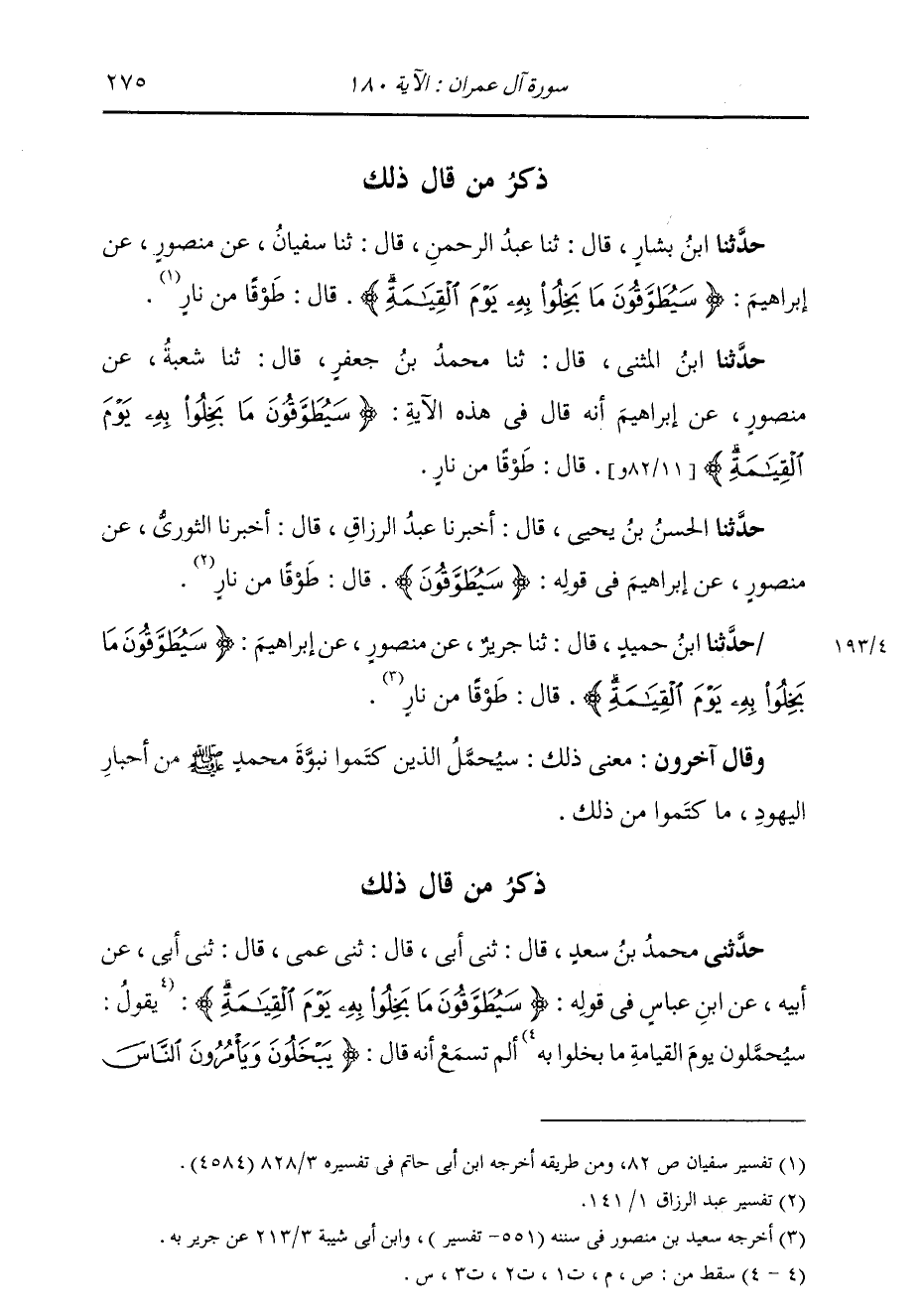 ذِكْرُ مَنْ قَالَ ذَلِكَ: حَدَّثَنَا ابْنُ بَشَّارٍ، قَالَ: ثنا عَبْدُ الرَّحْمَنِ، قَالَ: ثنا سُفْيَانُ، عَنْ مَنْصُورٍ، عَنْ إِبْرَاهِيمَ: {§سَيُطَوَّقُونَ مَا بَخِلُوا بِهِ يَوْمَ الْقِيَامَةِ} [آل عمران: 180] قَالَ: «طَوْقًا مِنَ النَّارِ»