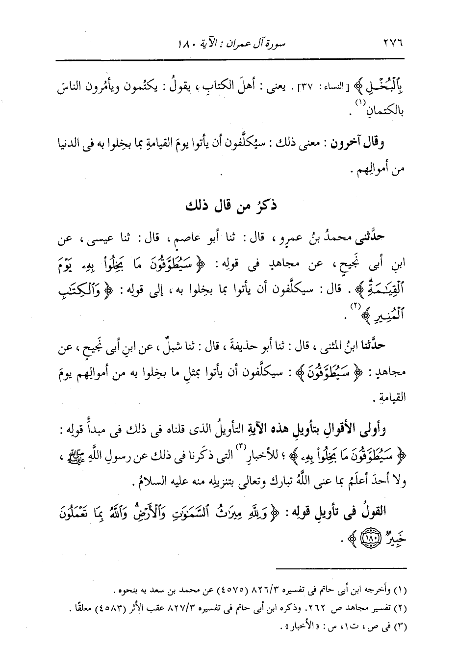 ذِكْرُ مَنْ قَالَ ذَلِكَ: حَدَّثَنِي مُحَمَّدُ بْنُ عَمْرٍو، قَالَ: ثنا أَبُو عَاصِمٍ، قَالَ: ثنا عِيسَى، عَنِ ابْنِ أَبِي نَجِيحٍ، عَنْ مُجَاهِدٍ، فِي قَوْلِهِ: {§سَيُطَوَّقُونَ مَا بَخِلُوا بِهِ يَوْمَ الْقِيَامَةِ} [آل عمران: 180] قَالَ: «سَيُكَلَّفُونَ أَنْ يَأْتُوا بِمَا بَخِلُوا بِهِ» إِلَى قَوْلِهِ: {وَالْكِتَابِ الْمُنِيرِ} [آل عمران: 184]