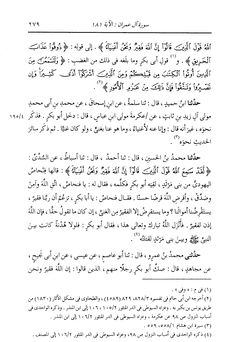 حَدَّثَنَا مُحَمَّدُ بْنُ الْحُسَيْنِ، قَالَ: ثنا أَحْمَدُ بْنُ مُفَضَّلٍ، قَالَ: ثنا أَسْبَاطٌ، عَنِ السُّدِّيِّ: {§لَقَدْ سَمِعَ اللَّهُ قَوْلَ الَّذِينَ قَالُوا إِنَّ اللَّهَ فَقِيرٌ وَنَحْنُ أَغْنِيَاءُ} [آل عمران: 181] " قَالَهَا فِنْحَاصٌ الْيَهُودِيُّ مِنْ بَنِي مَرْثَدٍ، لَقِيَهُ أَبُو بَكْرٍ فَكَلَّمَهُ، فَقَالَ لَهُ: يَا فِنْحَاصُ، اتَّقِ اللَّهَ وَآمِنْ وَصَدَّقْ، وَأقَرْضِ اللَّهَ قَرْضًا حَسَنًا، فَقَالَ فِنْحَاصٌ: يَا أَبَا بَكْرٍ، تَزْعُمُ أَنَّ رَبَّنَا فَقِيرٌ، يَسْتَقْرِضُنَا أَمْوَالَنَا، وَمَا يَسْتَقْرِضُ إِلَّا الْفَقِيرُ مِنَ الْغَنِيِّ، إِنْ كَانَ مَا تَقُولُ حَقًّا، فَإِنَّ اللَّهَ إِذًا لَفَقِيرٌ، فَأَنْزَلَ اللَّهُ عَزَّ وَجَلَّ هَذَا، فَقَالَ أَبُو بَكْرٍ: فَلَوْلَا هُدْنَةٌ كَانَتْ بَيْنَ النَّبِيِّ صَلَّى اللهُ عَلَيْهِ وَسَلَّمَ وَبَيْنَ بَنِي مَرْثَدٍ لَقَتَلْتُهُ "