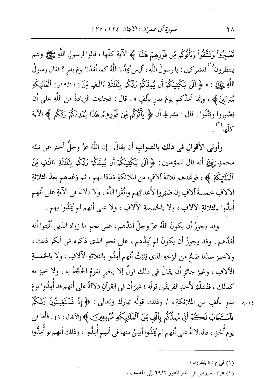 تَصْبِرُوا وَتَتَّقُوا وَيَأْتُوكُمْ مِنْ فَوْرِهِمْ هَذَا} [آل عمران: 125] الْآيَةَ كُلَّهَا قَالُوا لِرَسُولِ اللَّهِ صَلَّى اللهُ عَلَيْهِ وَسَلَّمَ، وَهُمْ يَنْظُرُونَ الْمُشْرِكِينَ: يَا رَسُولَ اللَّهِ أَلَيْسَ يَمُدُّنَا اللَّهُ كَمَا أَمَدَّنَا يَوْمَ بَدْرٍ؟ فَقَالَ رَسُولُ اللَّهِ صَلَّى اللهُ عَلَيْهِ وَسَلَّمَ: " {أَلَنْ يَكْفِيَكُمْ أَنْ يُمِدَّكُمْ رَبُّكُمْ بِثَلَاثَةِ آلَافٍ مِنَ الْمَلَائِكَةِ مُنْزَلِينَ} [آل عمران: 124] ، وَإِنَّمَا أَمَدَّكُمْ يَوْمَ بَدْرٍ بِأَلْفٍ؟ " قَالَ: فَجَاءَتِ الزِّيَادَةُ مِنَ اللَّهِ عَلَى أَنْ يَصْبِرُوا وَيَتَّقُوا، قَالَ: بِشَرْطٍ أَنْ {يَأْتُوكُمْ مِنْ فَوْرِهِمْ هَذَا يُمْدِدْكُمْ رَبُّكُمْ} [آل عمران: 125] ، الْآيَةَ كُلَّهَا " وَأَوْلَى الْأَقْوَالِ فِي ذَلِكَ بِالصَّوَابِ أَنْ يُقَالَ: إِنَّ اللَّهَ أَخْبَرَ عَنْ نَبِيِّهِ مُحَمَّدٍ صَلَّى اللهُ عَلَيْهِ وَسَلَّمَ أَنَّهُ قَالَ لِلْمُؤْمِنِينَ: {أَلَنْ يَكْفِيَكُمْ أَنْ يُمِدَّكُمْ رَبُّكُمْ بِثَلَاثَةِ آلَافٍ مِنَ الْمَلَائِكَةِ} [آل عمران: 124] فَوَعَدَهُمُ اللَّهُ بِثَلَاثَةِ آلَافٍ مِنَ الْمَلَائِكَةِ مَدَدًا لَهُمْ، ثُمَّ وَعَدَهُمْ بَعْدَ الثَّلَاثَةِ الْآلَافِ خَمْسَةَ آلَافٍ إِنْ صَبَرُوا لِأَعْدَائِهِمْ، وَاتَّقَوُا اللَّهَ، وَلَا دَلَالَةَ فِي الْآيَةِ عَلَى أَنَّهُمْ أُمِدُّوا بِالثَّلَاثَةِ آلَآفٍ، وَلَا بِالْخَمْسَةِ آلَافٍ، وَلَا عَلَى أَنَّهُمْ لَمْ يُمَدُّوا بِهِمْ. وَقَدْ يَجُوزُ أَنْ يَكُونَ اللَّهُ عَزَّ وَجَلَّ أَمَدَّهُمْ عَلَى نَحْوِ مَا رَوَاهُ الَّذِينَ أَثْبَتُوا أَنَّهُ أَمَدَّهُمْ، وَقَدْ يَجُوزُ أَنْ يَكُونَ لَمْ يُمِدُّهُمْ عَلَى نَحْوِ الَّذِي ذَكَرَهُ مَنْ أَنْكَرَ ذَلِكَ، وَلَا خَبَرَ عِنْدَنَا صَحَّ مِنَ الْوَجْهِ الَّذِي يُثْبِتُ أَنَّهُمْ أُمِدُّوا بِالثَّلَاثَةِ الْآلَافِ وَلَا بِالْخَمْسَةِ الْآلَافِ، وَغَيْرُ جَائِزٍ أَنْ يُقَالَ فِي ذَلِكَ قَوْلٌ إِلَّا بِخَبَرٍ تَقُومُ الْحُجَّةُ بِهِ، وَلَا خَبَرَ بِهِ كَذَلِكَ فَنُسَلِّمَ لِأَحَدِ الْفَرِيقَيْنِ قَوْلَهُ، غَيْرَ أَنَّ فِيَ الْقُرْآنِ دَلَالَةً عَلَى أَنَّهُمْ قَدْ أُمِدُّوا يَوْمَ بَدْرٍ بِأَلْفٍ مِنَ الْمَلَائِكَةِ وَذَلِكَ قَوْلُهُ: {إِذْ تَسْتَغِيثُونَ رَبَّكُمْ فَاسْتَجَابَ لَكُمْ أَنِّي مُمِدُّكُمْ بِأَلْفٍ مِنَ الْمَلَائِكَةِ مُرْدِفِينَ} [الأنفال: 9] فَأَمَّا فِي يَوْمِ أُحُدٍ، فَالدَّلَالَةُ عَلَى أَنَّهُمْ لَمْ يُمَدَّوا أَبْيَنُ مِنْهَا فِي أَنَّهُمْ أُمِدُّوا، وَذَلِكَ أَنَّهُمْ لَوْ أُمِدُّوا