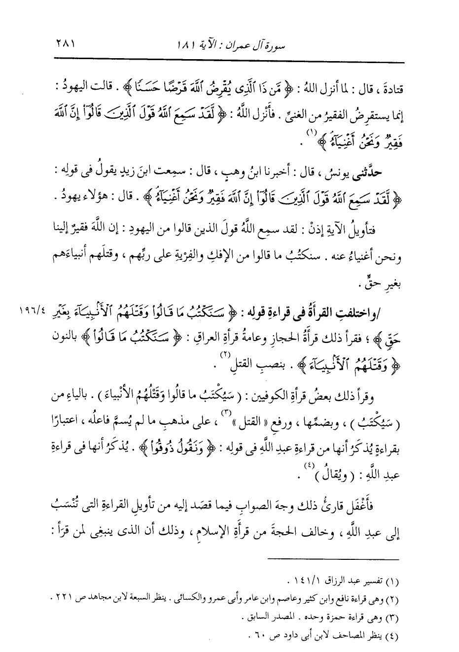 حَدَّثَنِي يُونُسُ، قَالَ: أَخْبَرَنَا ابْنُ وَهْبٍ، قَالَ: سَمِعْتُ ابْنَ زَيْدٍ، يَقُولُ فِي قَوْلِهِ: {§لَقَدْ سَمِعَ اللَّهُ، قَوْلَ الَّذِينَ قَالُوا إِنَّ اللَّهَ فَقِيرٌ وَنَحْنُ أَغْنِيَاءُ} [آل عمران: 181] قَالَ: " هَؤُلَاءِ الْيَهُودُ، فَتَأْوِيلُ الْآيَةِ إِذًا: لَقَدْ سَمِعَ اللَّهُ قَوْلَ الَّذِينَ قَالُوا مِنَ الْيَهُودِ: إِنَّ اللَّهَ فَقِيرٌ إِلَيْنَا وَنَحْنُ أَغْنِيَاءُ عَنْهُ، سَنَكْتُبُ مَا قَالُوا مِنَ الْإِفْكِ وَالْفِرْيَةِ عَلَى رَبِّهِمْ وَقَتْلَهُمْ أَنْبِيَاءَهُمْ بِغَيْرِ حَقٍّ " وَاخْتَلَفَتِ الْقُرَّاءُ فِي قِرَاءَةِ قَوْلِهِ: {سَنَكْتُبُ مَا قَالُوا وَقَتْلَهُمْ} [آل عمران: 181] فَقَرَأَ ذَلِكَ قُرَّاءُ الْحِجَازِ وَعَامَّةُ قُرَّاءِ الْعِرَاقِ: {سَنَكْتُبُ مَا قَالُوا} [آل عمران: 181] بِالنُّونِ {وَقَتْلَهُمُ الْأَنْبِيَاءَ بِغَيْرِ حَقٍّ} [آل عمران: 181] بِنَصْبِ الْقَتْلِ. وَقَرَأَ ذَلِكَ بَعْضُ قُرَّاءِ الْكُوفِيِّينَ: (سَيُكْتَبُ مَا قَالُوا وَقَتْلُهُمُ الْأَنْبِيَاءَ بِغَيْرِ حَقٍّ) بِالْيَاءِ مِنْ (سَيُكْتَبُ) وَبِضَمِّهَا وَرَفْعِ الْقَتْلِ عَلَى مَذْهَبِ مَا لَمْ يُسَمَّ فَاعِلُهُ، اعْتِبَارًا بِقِرَاءَةٍ يُذْكَرُ أَنَّهَا مِنْ قِرَاءَةِ عَبْدِ اللَّهِ فِي قَوْلِهِ: {وَنَقُولُ ذُوقُوا} [آل عمران: 181] ، يُذْكَرُ أَنَّهَا فِي قِرَاءَةِ عَبْدِ اللَّهِ: «وَيُقَالُ» فَأَغْفَلَ قَارِئُ ذَلِكَ وَجْهَ الصَّوَابِ فِيمَا قَصَدَ إِلَيْهِ مِنْ تَأْوِيلِ الْقِرَاءَةِ الَّتِي تُنْسَبُ إِلَى عَبْدِ اللَّهِ، وَخَالَفَ الْحُجَّةَ مِنْ قُرَّاءِ الْإِسْلَامِ، وَذَلِكَ أَنَّ الَّذِيَ يَنْبَغِي لِمَنْ قَرَأَ