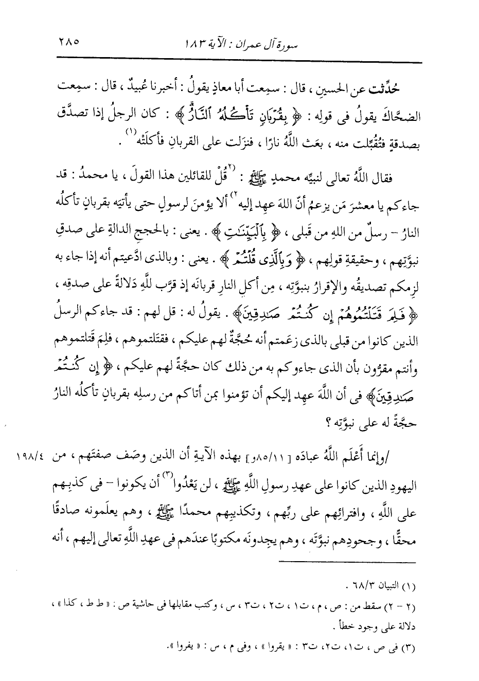حُدِّثْتُ عَنِ الْحُسَيْنِ، قَالَ: سَمِعْتُ أَبَا مُعَاذٍ، يَقُولُ: أَخْبَرَنَا عُبَيْدٌ، قَالَ: سَمِعْتُ الضَّحَّاكَ، يَقُولُ فِي قَوْلِهِ: {§بِقُرْبَانٍ تَأْكُلُهُ النَّارُ} [آل عمران: 183] «كَانَ الرَّجُلُ إِذَا تَصَدَّقَ بِصَدَقَةٍ، فَتُقُبِّلَتْ مِنْهُ بَعَثَ اللَّهُ نَارًا مِنَ السَّمَاءِ، فَنَزَلَتْ عَلَى الْقُرْبَانِ فَأَكَلَتْهُ» فَقَالَ اللَّهُ تَعَالَى لِنَبِيِّهِ مُحَمَّدٍ صَلَّى اللهُ عَلَيْهِ وَسَلَّمَ: {أَلَّا نُؤْمِنَ لِرَسُولٍ حَتَّى يَأْتِيَنَا بِقُرْبَانٍ تَأْكُلُهُ النَّارُ قُلْ قَدْ جَاءَكُمْ رُسُلٌ مِنْ قَبْلِي بِالْبَيِّنَاتِ} [آل عمران: 183] يَعْنِي: بِالْحُجَجِ الدَّالَّةِ عَلَى صِدْقِ نُبُوَّتِهِمْ وَحَقِيقَةِ قَوْلِهِمْ؛ {وَبِالَّذِي قُلْتُمْ} [آل عمران: 183] يَعْنِي: وَبِالَّذِي ادَّعَيْتُمْ أَنَّهُ إِذَا جَاءَ بِهِ لَزِمَكُمْ تَصْدِيقُهُ، وَالْإِقْرَارُ بِنُبُوَّتِهِ مِنْ أَكْلِ النَّارِ قُرْبَانَهُ إِذَا قُرِّبَ لِلَّهِ دَلَالَةً عَلَى صِدْقِهِ؛ {فَلِمَ قَتَلْتُمُوهُمْ إِنْ كُنْتُمْ صَادِقِينَ} [آل عمران: 183] يَقُولُ لَهُ: قُلْ لَهُمْ: قَدْ جَاءَتْكُمُ الرُّسُلُ الَّذِي كَانُوا مِنْ قَبْلِي بِالَّذِي زَعَمْتُمْ أَنَّهُ حُجَّةٌ لَهُمْ عَلَيْكُمْ، فَقَتَلْتُمُوهُمْ، فَلِمَ قَتَلْتُمُوهُمْ وَأَنْتُمْ مُقِرُّونَ بِأَنَّ الَّذِي جَاءُوكُمْ بِهِ مِنْ ذَلِكَ كَانَ حُجَّةً لَهُمْ عَلَيْكُمْ إِنْ كُنْتُمْ صَادِقِينَ فِي أَنَّ اللَّهَ عَهِدَ إِلَيْكُمْ أَنْ تُؤْمِنُوا بِمَنْ أَتَاكُمْ مِنْ رُسُلِهِ بِقُرْبَانٍ تَأْكُلُهُ النَّارُ حُجَّةً لَهُ عَلَى نُبُوَّتِهِ؟ وَإِنَّمَا أَعْلَمَ اللَّهُ عِبَادَهُ بِهَذِهِ الْآيَةِ، أَنَّ الَّذِينَ وَصَفَ صِفَتَهُمْ مِنَ الْيَهُودِ الَّذِينَ كَانُوا عَلَى عَهْدِ رَسُولِ اللَّهِ صَلَّى اللهُ عَلَيْهِ وَسَلَّمَ، لَنْ يَفِرُّوا، وَأَنْ يَكُونُوا فِي كَذِبِهِمْ عَلَى اللَّهِ، وَافْتِرَائِهِمْ عَلَى رَبِّهِمْ، وَتَكْذِيبِهِمْ مُحَمَّدًا صَلَّى اللهُ عَلَيْهِ وَسَلَّمَ وَهُمْ يَعْلَمُونَهُ صَادِقًا مُحِقًّا، وَجُحُودِهِمْ نُبُوَّتَهُ، وَهُمْ يَجِدُونَهُ مَكْتُوبًا عِنْدَهُمْ فِي عَهْدِ اللَّهِ تَعَالَى إِلَيْهِمْ أَنَّهَ