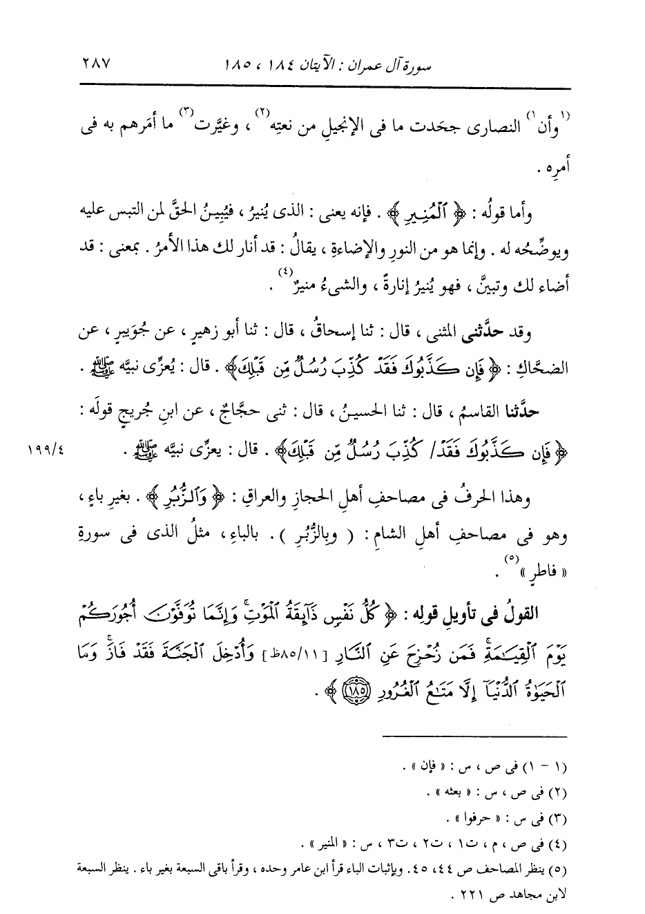 وَأَنَّ النَّصَارَى جَحَدَتْ مَا فِي الْإِنْجِيلِ مِنْ نَعْتِهِ وَغَيَّرَتْ مَا أَمَرَهُمْ بِهِ فِي أَمْرِهِ وَأَمَّا قَوْلُهُ: {الْمُنِيرِ} [آل عمران: 184] فَإِنَّهُ يَعْنِي: الَّذِي يُنِيرُ فَيُبَيِّنُ الْحَقَّ لِمَنْ الْتَبَسَ عَلَيْهِ وَيُوَضِّحُهُ، وَإِنَّمَا هُوَ مِنَ النُّورِ وَالْإِضَاءَةِ، يُقَالُ: قَدْ أَنَارَ لَكَ هَذَا الْأَمْرُ، بِمَعْنَى: أَضَاءَ لَكَ وَتَبَيَّنَ، فَهُوَ يُنِيرُ إِنَارَةً، وَالشَّيْءُ الْمُنِيرُ