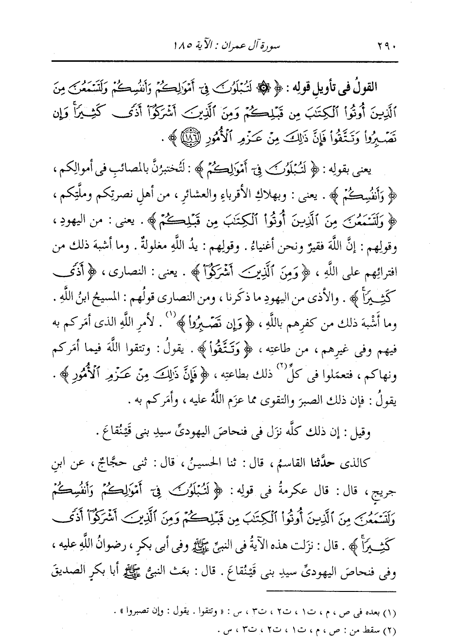 §الْقَوْلُ فِي تَأْوِيلِ قَوْلِهِ تَعَالَى: {لَتُبْلَوُنَّ فِي أَمْوَالِكُمْ وَأَنْفُسِكُمْ وَلَتَسْمَعُنَّ مِنَ الَّذِينَ أُوتُوا الْكِتَابَ مِنْ قَبْلِكُمْ وَمِنَ الَّذِينَ أَشْرَكُوا أَذًى كَثِيرًا وَإِنْ تَصْبِرُوا وَتَتَّقُوا فَإِنَّ ذَلِكَ مِنْ عَزْمِ الْأُمُورِ} [آل عمران: 186] يَعْنِي بِذَلِكَ تَعَالَى ذِكْرُهُ: {لَتُبْلَوُنَّ فِي أَمْوَالِكُمُ} [آل عمران: 186] لَتُخْتَبَرُنَّ بِالْمَصَائِبِ فِي أَمْوَالِكُمْ وَأَنْفُسِكُمْ، يَعْنِي: وَبِهَلَاكِ الْأَقْرِبَاءِ وَالْعَشَائِرِ مِنْ أَهْلِ نُصْرَتِكُمْ وَمِلَّتِكُمْ {وَلَتَسْمَعُنَّ مِنَ الَّذِينَ أُوتُوا الْكِتَابَ مِنْ قَبْلِكُمْ} [آل عمران: 186] يَعْنِي: مِنَ الْيَهُودِ وَقَوْلِهِمْ {إِنَّ اللَّهَ فَقِيرٌ وَنَحْنُ أَغْنِيَاءُ} [آل عمران: 181] وَقَوْلِهِمْ {يَدُ اللَّهِ مَغْلُولَةٌ} [المائدة: 64] وَمَا أَشْبَهَ ذَلِكَ مِنَ افْتِرَائِهِمْ عَلَى اللَّهِ {وَمِنَ الَّذِينَ أَشْرَكُوا} [البقرة: 96] يَعْنِي النَّصَارَى، {أَذًى كَثِيرًا} [آل عمران: 186] وَالْأَذَى مِنَ الْيَهُودِ مَا ذَكَرْنَا، وَمِنَ النَّصَارَى قَوْلُهُمْ: الْمَسِيحُ ابْنُ اللَّهِ، وَمَا أَشْبَهَ ذَلِكَ مِنْ كُفْرِهِمْ بِاللَّهِ {وَإِنْ تَصْبِرُوا وَتَتَّقُوا} [آل عمران: 120] يَقُولُ: وَإِنْ تَصْبِرُوا لِأَمْرِ اللَّهِ الَّذِي أَمَرَكُمْ بِهِ فِيهِمْ وَفِي غَيْرِهِمْ مِنْ طَاعَتِهِ وَتَتَّقُوا، يَقُولُ: وَتَتَّقُوا اللَّهَ فِيمَا أَمَرَكُمْ وَنَهَاكُمْ، فَتَعْمَلُوا فِي ذَلِكَ بِطَاعَتِهِ. {فَإِنَّ ذَلِكَ مِنْ عَزْمِ الْأُمُورِ} [آل عمران: 186] يَقُولُ: فَإِنَّ ذَلِكَ الصَّبْرَ وَالتَّقْوَى مِمَّا عَزَّمَ اللَّهُ عَلَيْهِ وَأَمَرَكُمْ بِهِ. وَقِيلَ: إِنَّ ذَلِكَ كُلَّهُ نَزَلَ فِي فِنْحَاصٍ الْيَهُودِيِّ سَيِّدِ بَنِي قَيْنُقَاعَ