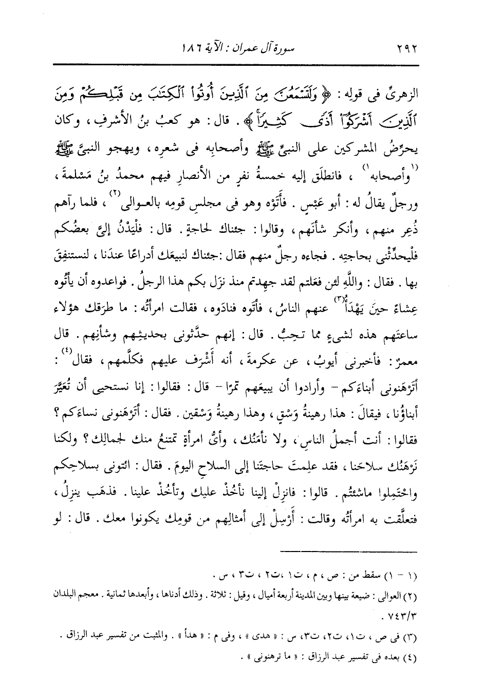 قَالَ مَعْمَرٌ: فَأَخْبَرَنِي أَيُّوبُ عَنْ عِكْرِمَةَ أَنَّهُ أَشْرَفَ عَلَيْهِمْ فَكَلَّمَهُمْ، فَقَالَ: «§أَتُرْهِنُونِي أَبْنَاءَكُمْ؟ وَأَرَادُوا أَنْ يَبِيعَهُمْ تَمْرًا» قَالَ: فَقَالُوا إِنَّا نَسْتَحْيِي أَنْ تُعَيَّرَ أَبْنَاؤُنَا فَيُقَالَ هَذَا رَهِينَةُ وَسْقٍ، وَهَذَا رَهِينَةُ وَسْقَيْنِ، فَقَالَ: «أَتُرْهِنُونِي نِسَاءَكُمْ؟» قَالُوا: أَنْتَ أَجْمَلُ النَّاسِ، وَلَا نَأْمَنُكَ، وَأَيُّ امْرَأَةٍ تَمْتَنِعُ مِنْكَ لِجَمَالِكَ؟ وَلَكِنَّا نُرْهِنُكَ سِلَاحَنَا، فَقَدْ عَلِمْتَ حَاجَتِنَا إِلَى السِّلَاحِ الْيَوْمَ، فَقَالَ: «ائْتُونِي بِسِلَاحِكُمْ، وَاحْتَمِلُوا مَا شِئْتُمْ» قَالُوا: فَانْزِلْ إِلَيْنَا نَأْخُذْ عَلَيْكَ، وَتَأْخُذْ عَلَيْنَا، فَذَهَبَ يَنْزِلُ، فَتَعَلَّقَتْ بِهِ امْرَأَتُهُ وَقَالَتْ: أَرْسِلْ إِلَى أَمْثَالِهِمْ مِنْ قَوْمِكَ يَكُونُوا مَعَكَ، قَالَ: «لَوْ -[293]- وَجَدَنِي هَؤُلَاءِ نَائِمًا مَا أَيْقَظُونِي» قَالَتْ: فَكَلِّمْهُمْ مِنْ فَوْقِ الْبَيْتِ، فَأَبَى عَلَيْهَا، فَنَزَلَ إِلَيْهِمْ يَفُوحُ رِيحُهُ، قَالُوا: مَا هَذِهِ الرِّيحُ يَا فُلَانُ؟ قَالَ: «هَذَا عِطْرُ أُمِّ فُلَانٍ امْرَأَتِهِ» فَدَنَا إِلَيْهِ بَعْضُهُمْ يَشُمُّ رَائِحَتَهُ، ثُمَّ اعْتَنَقَهُ، ثُمَّ قَالَ: اقْتُلُوا عَدُوَّ اللَّهِ، فَطَعَنَهُ أَبُو عَبْسٍ فِي خَاصِرَتِهِ، وَعَلَاهُ مُحَمَّدُ بْنُ مَسْلَمَةَ بِالسَّيْفِ، فَقَتَلُوهُ، ثُمَّ رَجَعُوا. فَأَصْبَحَتِ الْيَهُودُ مُذْعُورِينَ، فَجَاءُوا إِلَى النَّبِيِّ صَلَّى اللهُ عَلَيْهِ وَسَلَّمَ، فَقَالُوا: قُتِلَ سَيِّدُنَا غِيلَةً، فَذَكَّرَهُمُ النَّبِيُّ صَلَّى اللهُ عَلَيْهِ وَسَلَّمَ صَنِيعَهُ، وَمَا كَانَ يَحُضُّ عَلَيْهِمْ، وَيُحَرِّضُ فِي قِتَالِهِمْ، وَيُؤْذِيهِمْ، ثُمَّ دَعَاهُمْ إِلَى أَنْ يَكْتُبَ بَيْنَهُ وَبَيْنَهُمْ صُلْحًا، فَقَالَ: فَكَانَ ذَلِكَ الْكِتَابُ مَعَ عَلِيٍّ رِضْوَانُ اللَّهِ عَلَيْهِ
