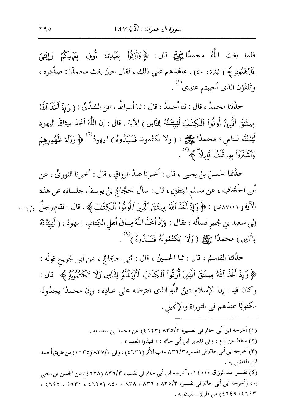 حَدَّثَنَا الْقَاسِمُ، قَالَ: ثنا الْحُسَيْنُ، قَالَ: ثني حَجَّاجٌ، عَنِ ابْنِ جُرَيْجٍ، قَوْلُهُ: (§وَإِذْ أَخَذَ اللَّهُ مِيثَاقَ الَّذِينَ أُوتُوا الْكِتَابَ لَيُبَيِّنُنَّهُ لِلنَّاسِ وَلَا يَكْتُمُونَهُ) قَالَ: «وَكَانَ فِيهِ أَنَّ الْإِسْلَامَ دِينُ اللَّهِ الَّذِي افْتَرَضَهُ عَلَى عِبَادِهِ، وَأَنَّ مُحَمَّدًا يَجِدُونَهُ مَكْتُوبًا عِنْدَهُمْ فِي التَّوْرَاةِ وَالْإِنْجِيلِ» -[296]- وَقَالَ آخَرُونَ: عُنِيَ بِذَلِكَ كُلُّ مَنْ أُوتِيَ عِلْمًا بِأَمْرِ الدِّينِ