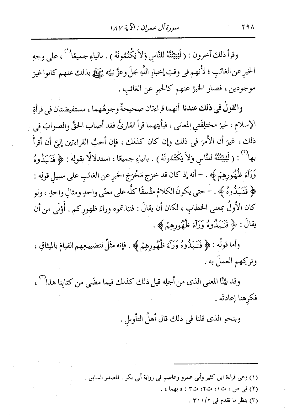 وَقَرَأَ ذَلِكَ آخَرُونَ: (لَيُبَيِّنُنَّهُ لِلنَّاسِ وَلَا يَكْتُمُونَهُ) بِالْيَاءِ جَمِيعًا عَلَى وَجْهِ الْخَبَرِ عَنِ الْغَائِبِ؛ لِأَنَّهُمْ فِي وَقْتِ إِخْبَارِ اللَّهِ نَبِيَّهُ صَلَّى اللهُ عَلَيْهِ وَسَلَّمَ بِذَلِكَ عَنْهُمْ كَانُوا غَيْرَ مَوْجُودِينَ، فَصَارَ الْخَبَرُ عَنْهُمْ كَالْخَبَرِ عَنِ الْغَائِبِ. وَالْقَوْلُ فِي ذَلِكَ عِنْدَنَا: أَنَّهُمَا قِرَاءَتَانِ صَحِيحَةٌ وُجُوهُهُمَا، مُسْتَفِيضَتَانِ فِي قِرَاءَةِ الْإِسْلَامِ، غَيْرَ مُخْتَلِفَتَيِ الْمَعَانِي، فَبِأَيَّتِهِمَا قَرَأَ الْقَارِئُ فَقَدْ أَصَابَ الْحَقَّ وَالصَّوَابَ فِي ذَلِكَ، غَيْرَ أَنَّ الْأَمْرَ فِي ذَلِكَ وَإِنْ كَانَ كَذَلِكَ، فَإِنَّ أَحَبَّ الْقِرَاءَتَيْنِ إِلَيَّ أَنْ أَقْرَأَ بِهَا: (لَيُبَيِّنُنَّهُ لِلنَّاسِ وَلَا يَكْتُمُونَهُ) بِالْيَاءِ جَمِيعًا اسْتِدْلَالًا بِقَوْلِهِ: {فَنَبَذُوهُ} [آل عمران: 187] أَنَّهُ إِذَا كَانَ قَدْ خَرَجَ مَخْرَجَ الْخَبَرِ عَنِ الْغَائِبِ عَلَى سَبِيلِ قَوْلِهِ: {فَنَبَذَوهُ} [آل عمران: 187] حَتَّى يَكُونَ مُتَّسِقًا كُلُّهُ عَلَى مَعْنًى وَاحِدٍ وَمِثَالٍ وَاحِدٍ، وَلَوْ كَانَ الْأَوَّلُ بِمَعْنَى الْخِطَابِ لَكَانَ أَنْ يُقَالَ: فَنَبَذْتُمُوهُ وَرَاءَ ظُهُورِكُمْ، أَوْلَى مِنْ أَنْ يُقَالَ: فَنَبَذُوهُ وَرَاءَ ظُهُورِهِمْ. وَأَمَّا قَوْلُهُ: {فَنَبَذُوهُ وَرَاءَ ظُهُورِهِمْ} [آل عمران: 187] فَإِنَّهُ مَثَلٌ لِتَضْيِيعِهِمُ الْقِيَامَ بِالْمِيثَاقِ، وَتَرْكِهِمُ الْعَمَلَ بِهِ. وَقَدْ بَيَّنَّا الْمَعْنَى الَّذِي مِنْ أَجْلِهِ قِيلَ ذَلِكَ كَذَلِكَ فِيمَا مَضَى مِنْ كِتَابِنَا هَذَا، فَكَرِهْنَا إِعَادَتَهُ. وَبِنَحْوِ الَّذِي قُلْنَا فِي ذَلِكَ، قَالَ أَهْلُ التَّأْوِيلِ