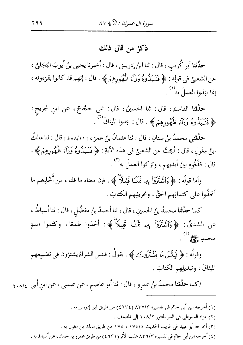 حَدَّثَنِي مُحَمَّدُ بْنُ سِنَانٍ، قَالَ: ثنا عُثْمَانُ بْنُ عُمَرَ، قَالَ: ثنا مَالِكُ بْنُ مِغْوَلٍ، قَالَ: نُبِّئْتُ عَنِ الشَّعْبِيِّ فِي هَذِهِ الْآيَةِ: {§فَنَبَذُوهُ وَرَاءَ ظُهُورِهِمْ} [آل عمران: 187] قَالَ: «قَذَفُوهُ بَيْنَ أَيْدِيهِمْ، وَتَرَكُوا الْعَمَلَ بِهِ» وَأَمَّا قَوْلُهُ {وَاشْتَرُوا بِهِ ثَمَنًا قَلِيلًا} [آل عمران: 187] فَإِنَّ مَعْنَاهُ مَا قُلْنَا مِنْ أَخْذِهِمْ مَا أَخَذُوا عَلَى كِتْمَانِهِمُ الْحَقَّ وَتَحْرِيفِهِمُ الْكِتَابَ