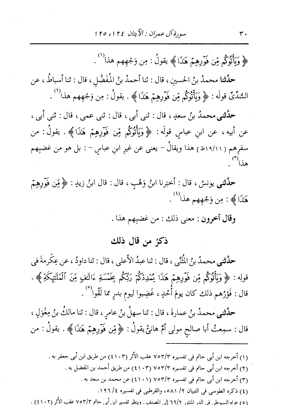 حَدَّثَنِي مُحَمَّدُ بْنُ سَعْدٍ، قَالَ: ثني أَبِي، قَالَ: ثني عَمِّي، قَالَ: ثني أَبِي، عَنْ أَبِيهِ، عَنِ ابْنِ عَبَّاسٍ، قَوْلُهُ: {§وَيَأْتُوكُمْ مِنْ فَوْرِهِمْ هَذَا} [آل عمران: 125] يَقُولُ: «مِنْ سَفَرِهِمْ هَذَا» وَيُقَالُ: يَعْنِي عَنْ غَيْرِ ابْنِ عَبَّاسٍ، بَلْ هُوَ مِنْ غَضَبِهِمْ هَذَا