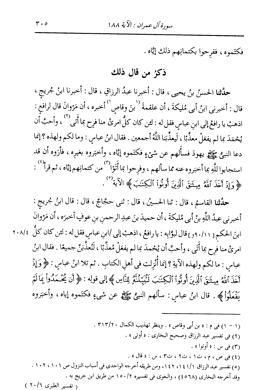 حَدَّثَنَا الْقَاسِمُ، قَالَ: ثنا الْحُسَيْنُ، قَالَ: ثني حَجَّاجٌ، قَالَ: قَالَ ابْنُ جُرَيْجٍ: أَخْبَرَنِي عَبْدُ اللَّهِ بْنُ أَبِي مُلَيْكَةَ أَنَّ حُمَيْدَ بْنَ عَبْدِ الرَّحْمَنِ بْنِ عَوْفٍ أَخْبَرَهُ أَنَّ مَرْوَانَ بْنَ الْحَكَمِ قَالَ لِبَوَّابِهِ: يَا رَافِعُ اذْهَبْ إِلَى ابْنِ عَبَّاسٍ، فَقُلْ لَهُ: لَئِنْ كَانَ كُلُّ امْرِئٍ مِنَّا فَرِحَ بِمَا أَتَى وَأَحَبَّ أَنْ يُحْمَدَ بِمَا لَمْ يَفْعَلْ مُعَذَّبًا، لَنُعَذَّبَنَّ جَمِيعًا فَقَالَ ابْنُ عَبَّاسٍ: «مَا لَكُمْ وَلِهَذِهِ الْآيَةِ؟ إِنَّمَا أُنْزِلَتْ فِي أَهْلِ الْكِتَابِ» ثُمَّ تَلَا ابْنُ عَبَّاسٍ: {§وَإِذْ أَخَذَ اللَّهُ مِيثَاقَ الَّذِينَ أُوتُوا الْكِتَابَ لَتُبَيِّنُنَّهُ لِلنَّاسِ} [آل عمران: 187] إِلَى قَوْلِهِ: {أَنْ يُحْمَدُوا بِمَا لَمْ يَفْعَلُوا} [آل عمران: 188] قَالَ ابْنُ عَبَّاسٍ: «سَأَلَهُمُ النَّبِيُّ صَلَّى اللهُ عَلَيْهِ وَسَلَّمَ عَنْ شَيْءٍ فَكَتَمُوهُ إِيَّاهُ، وَأَخْبَرُوهُ -[306]- بِغَيْرِهِ، فَخَرَجُوا وَقَدْ أَرَوْهُ أَنْ قَدْ أَخْبَرُوهُ بِمَا قَدْ سَأَلَهُمْ عَنْهُ، فَاسْتَحْمَدُوا بِذَلِكَ إِلَيْهِ، وَفَرِحُوا بِمَا أَتَوْا مِنْ كِتْمَانِهِمْ إِيَّاهُ مَا سَأَلَهُمْ عَنْهُ» وَقَالَ آخَرُونَ: بَلْ عُنِيَ بِذَلِكَ قَوْمٌ مِنْ يَهُودَ أَظْهَرُوا النِّفَاقَ لِلنَّبِيِّ صَلَّى اللهُ عَلَيْهِ وَسَلَّمَ مَحَبَّةً مِنْهُمْ لِلْحَمْدِ، وَاللَّهُ عَالِمٌ مِنْهُمْ خِلَافَ ذَلِكَ