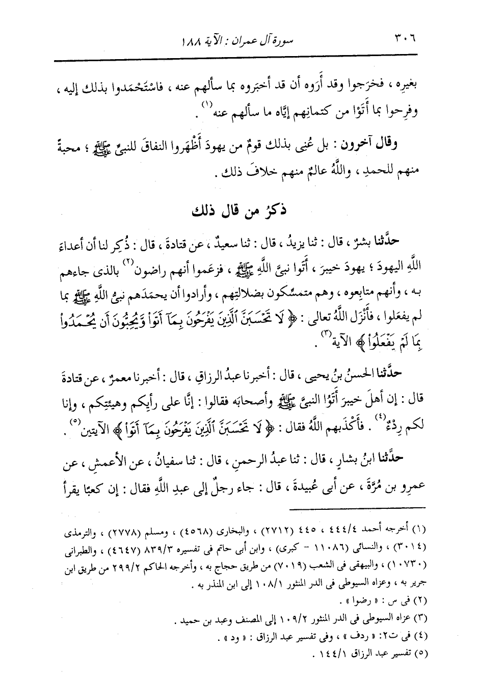 ذِكْرُ مَنْ قَالَ ذَلِكَ: حَدَّثَنَا بِشْرٌ، قَالَ: ثنا يَزِيدُ، قَالَ: ثنا سَعِيدٌ، عَنْ قَتَادَةَ: ذُكِرَ لَنَا أَنَّ أَعْدَاءَ اللَّهِ، الْيَهُودَ يَهُودَ خَيْبَرَ أَتَوْا نَبِيَّ اللَّهِ صَلَّى اللهُ عَلَيْهِ وَسَلَّمَ، فَزَعَمُوا أَنَّهُمْ رَاضُونَ بِالَّذِي جَاءَ بِهِ، وَأَنَّهُمْ مُتَابِعُوهُ وَهُمْ مُتَمَسِّكُونَ بِضَلَالَتِهِمْ، وَأَرَادُوا أَنْ يَحْمَدَهُمْ نَبِيُّ اللَّهِ صَلَّى اللهُ عَلَيْهِ وَسَلَّمَ بِمَا لَمْ يَفْعَلُوا، فَأَنْزَلَ اللَّهُ تَعَالَى: {§لَا تَحْسَبَنَّ الَّذِينَ يَفْرَحُونَ بِمَا أَتَوْا وَيُحِبُّونَ أَنْ يُحْمَدُوا بِمَا لَمْ يَفْعَلُوا} [آل عمران: 188] الْآيَةَ "