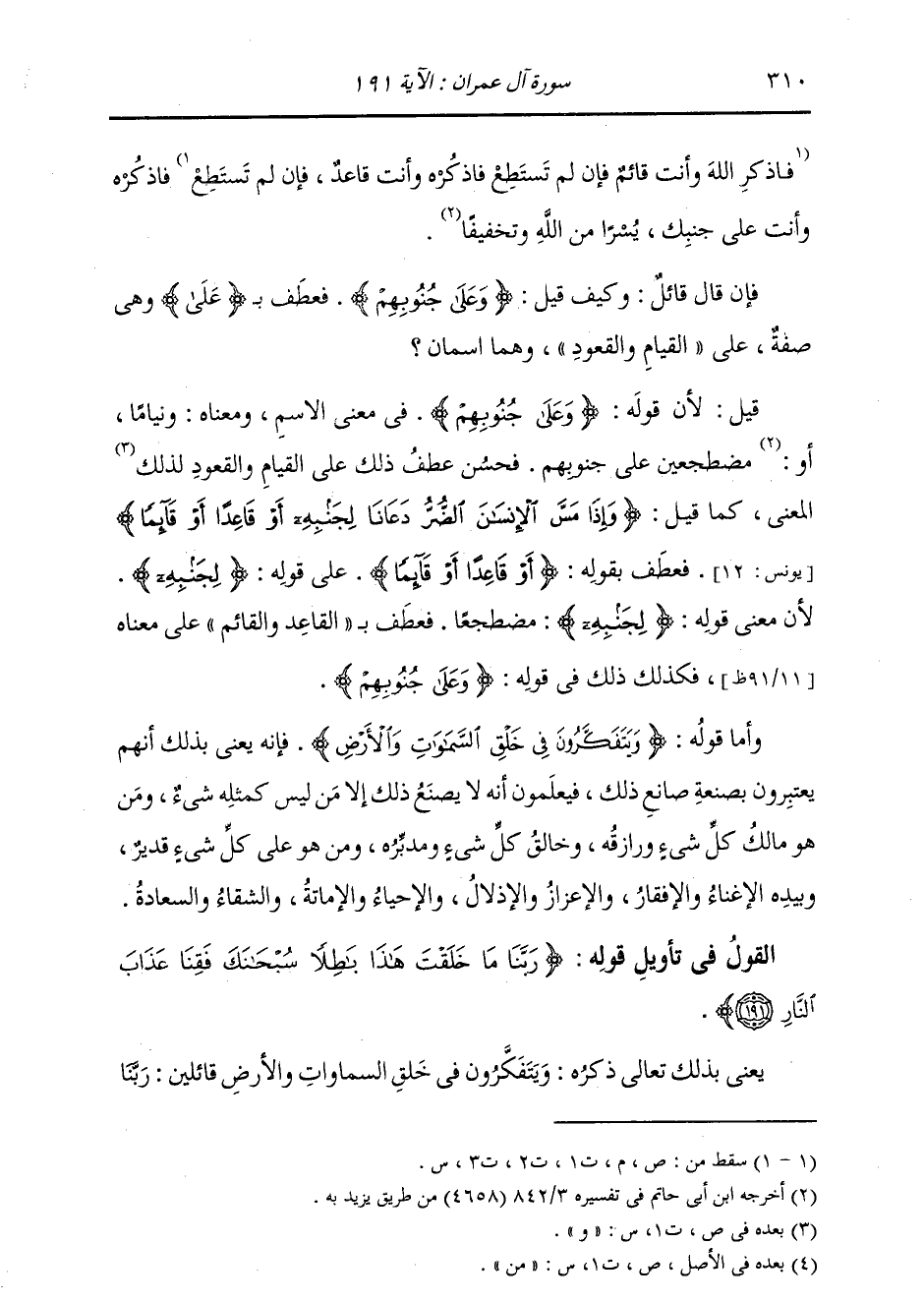 §الْقَوْلُ فِي تَأْوِيلِ قَوْلِهِ تَعَالَى: {رَبَّنَا مَا خَلَقْتَ هَذَا بَاطِلًا سُبْحَانَكَ فَقِنَا عَذَابَ النَّارِ} [آل عمران: 191] يَعْنِي بِذَلِكَ تَعَالَى ذِكْرُهُ: وَيَتَفَكَّرُونَ فِي خَلْقِ السَّمَاوَاتِ وَالْأَرْضِ، قَائِلِينَ: {رَبَّنَا