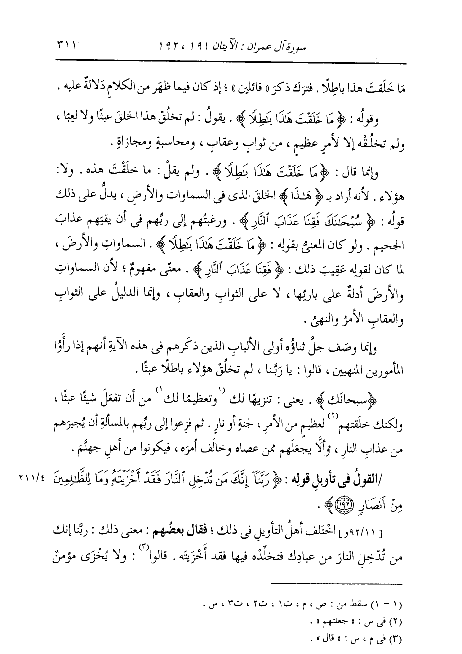 مَا خَلَقْتَ هَذَا بَاطِلًا} [آل عمران: 191] فَتَرَكَ ذِكْرَ قَائِلِينَ، إِذْ كَانَ فِيمَا ظَهَرَ مِنَ الْكَلَامِ دَلَالَةٌ عَلَيْهِ؛ وَقَوْلُهُ: {مَا خَلَقْتَ هَذَا بَاطِلًا} [آل عمران: 191] يَقُولُ: لَمْ تَخْلُقْ هَذَا الْخَلْقَ عَبَثًا وَلَا لَعِبًا، لَمْ تَخْلُقْهُ إِلَّا لِأَمْرٍ عَظِيمٍ مِنْ ثَوَابٍ وَعِقَابٍ وَمُحَاسَبَةٍ وَمُجَازَاةٍ، وَإِنَّمَا قَالَ: مَا خَلَقْتَ هَذَا بَاطِلًا، وَلَمْ يَقُلْ: مَا خَلَقْتَ هَذِهِ، وَلَا هَؤُلَاءِ؛ لِأَنَّهُ أَرَادَ بِهَذَا الْخَلْقَ الَّذِي فِي السَّمَاوَاتِ وَالْأَرْضِ، يَدُلُّ عَلَى ذَلِكَ قَوْلُهُ: {سُبْحَانَكَ فَقِنَا عَذَابَ النَّارِ} [آل عمران: 191] وَرَغْبَتُهُمْ إِلَى رَبِّهِمْ فِي أَنْ يَقِيَهُمْ عَذَابَ الْجَحِيمِ، وَلَوْ كَانَ الْمَعْنِيَّ بِقَوْلِهِ: {مَا خَلَقْتَ هَذَا بَاطِلًا} [آل عمران: 191] السَّمَاوَاتِ وَالْأَرْضَ، لَمَا كَانَ لِقَوْلِهِ عُقَيْبَ ذَلِكَ: {فَقِنَا عَذَابَ النَّارِ} [آل عمران: 191] مَعْنًى مَفْهُومٌ؛ لِأَنَّ السَّمَاوَاتِ وَالْأَرْضَ أَدِلَّةٌ عَلَى بَارِئِهَا، لَا عَلَى الثَّوَابِ وَالْعِقَابِ، وَإِنَّمَا الدَّلِيلُ عَلَى الثَّوَابِ وَالْعِقَابِ الْأَمْرُ وَالنَّهْي؛ وَإِنَّمَا وَصَفَ جَلَّ ثناؤُهُ أُولِي الْأَلْبَابِ الَّذِينَ ذَكَرَهُمْ فِي هَذِهِ الْآيَةِ، أَنَّهُمْ إِذَا رَأَوُا الْمَأْمُورِينَ الْمَنِهِيِّينَ، قَالُوا: يَا رَبَّنَا لَمْ تَخْلُقْ هَؤُلَاءِ بَاطِلًا عَبَثًا سُبْحَانَكَ، يَعْنِي: تَنْزِيهًا لَكَ مِنْ أَنْ تَفْعَلَ شَيْئًا عَبَثًا، وَلَكِنَّكَ خَلَقْتَهُمْ لَعَظِيمٍ مِنَ الْأَمْرِ، لِجَنَّةٍ أَوْ نَارٍ، ثُمَّ فَزِعُوا إِلَى رَبِّهِمْ بِالْمَسْأَلَةِ أَنْ يُجِيرَهُمْ مِنْ عَذَابِ النَّارِ، وَأَنْ لَا يَجْعَلَهُمْ مِمَّنْ عَصَاهُ وَخَالَفَ أَمْرَهُ، فَيَكُونُوا مِنْ أَهْلِ جَهَنَّمَ