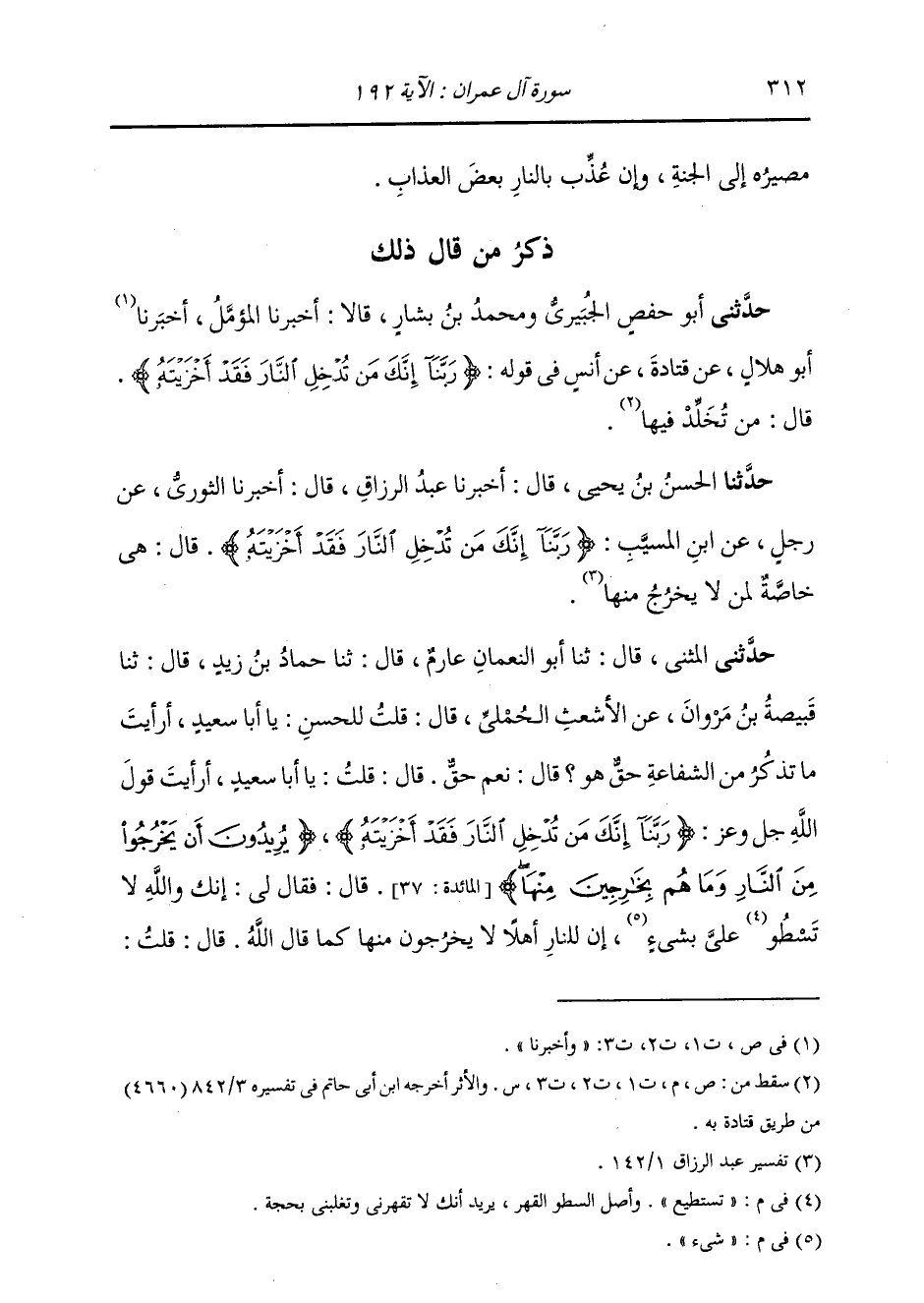 حَدَّثَنِي الْمُثَنَّى، قَالَ: ثنا أَبُو النُّعْمَانِ عَارِمٌ، قَالَ: ثنا حَمَّادُ بْنُ زَيْدٍ، قَالَ: ثنا قَبِيصَةُ بْنُ مَرْوَانَ، عَنِ الْأَشْعَثِ الْحَمْلِيِّ، قَالَ: قُلْتُ لِلْحَسَنِ: يَا أَبَا سَعِيدٍ أَرَأَيْتَ مَا تَذْكُرُ مِنَ الشَّفَاعَةِ حَقٌّ هُوَ؟ قَالَ: «نَعَمْ حَقٌّ» قَالَ: قُلْتُ يَا أَبَا سَعِيدٍ أَرَأَيْتَ قَوْلَ اللَّهِ تَعَالَى: {§رَبَّنَا إِنَّكَ مَنْ تُدْخِلِ النَّارَ فَقَدْ أَخْزَيْتَهُ} [آل عمران: 192] ، وَ {يُرِيدُونَ أَنْ يَخْرُجُوا مِنَ النَّارِ وَمَا هُمْ بِخَارِجِينَ مِنْهَا} [المائدة: 37] ، قَالَ: فَقَالَ لِي: " إِنَّكَ وَاللَّهِ لَا تَسْتَطِيعُ عَلَى شَيْءٍ، إِنَّ لِلنَّارِ أَهْلًا لَا يَخْرُجُونَ مِنْهَا كَمَا قَالَ اللَّهُ، قَالَ: قُلْتُ -[313]- يَا أَبَا سَعِيدٍ: فِيمَنْ دَخَلُوا ثُمَّ خَرَجُوا؟ قَالَ: كَانُوا أَصَابُوا ذَنُوبًا فِي الدُّنْيَا، فَأَخَذَهُمُ اللَّهُ بِهَا فَأَدْخَلَهُمْ بِهَا، ثُمَّ أَخْرَجَهُمْ بِمَا يَعْلَمُ فِي قُلُوبِهِمْ مِنَ الْإِيمَانِ وَالتَّصْدِيقِ بِهِ "