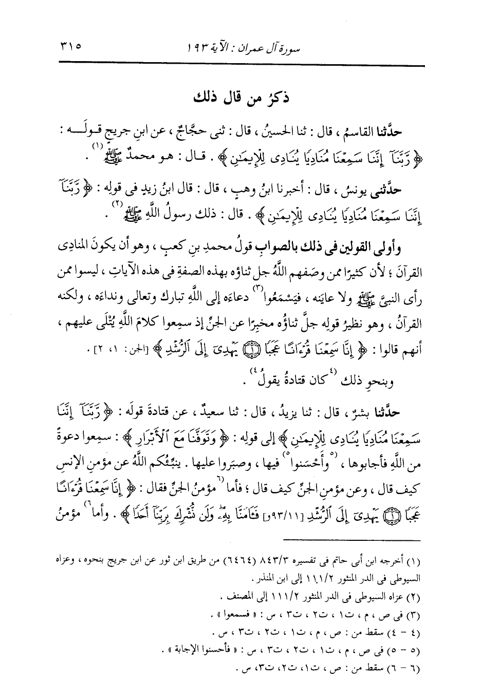 حَدَّثَنِي يُونُسُ، قَالَ: أَخْبَرَنَا ابْنُ وَهْبٍ، قَالَ: قَالَ ابْنُ زَيْدٍ فِي قَوْلِهِ: {§رَبَّنَا إِنَّنَا سَمِعْنَا مُنَادِيًا يُنَادِي لِلْإِيمَانِ} [آل عمران: 193] قَالَ: «ذَلِكَ رَسُولُ اللَّهِ صَلَّى اللهُ عَلَيْهِ وَسَلَّمَ» وَأَوْلَى الْقَوْلَيْنِ فِي ذَلِكَ بِالصَّوَابِ قَوْلُ مُحَمَّدِ بْنِ كَعْبٍ، وَهُوَ أَنْ يَكُونَ الْمُنَادِي الْقُرْآنَ؛ لِأَنَّ كَثِيرًا مِمَّنْ وَصَفَهُمُ اللَّهُ بِهَذِهِ الصُّفَّةِ فِي هَذِهِ الْآيَاتِ لَيْسُوا مِمَّنْ رَأَى النَّبِيَّ صَلَّى اللهُ عَلَيْهِ وَسَلَّمَ وَلَا عَايَنَهُ، فَسَمِعُوا دُعَاءَهُ إِلَى اللَّهِ تَبَارَكَ وَتَعَالَى وَنِدَاءَهُ، وَلَكِنَّهُ الْقُرْآنُ. وَهُوَ نُظِيرُ قَوْلِهِ جَلَّ ثناؤُهُ مُخْبِرًا عَنِ الْجِنِّ إِذْ سَمِعُوا كَلَامَ اللَّهِ يُتْلَى عَلَيْهِمْ أَنَّهُمْ قَالُوا: {إِنَّا سَمِعْنَا قُرْآنًا عَجَبًا يَهْدِي إِلَى الرُّشْدِ} [الجن: 2]