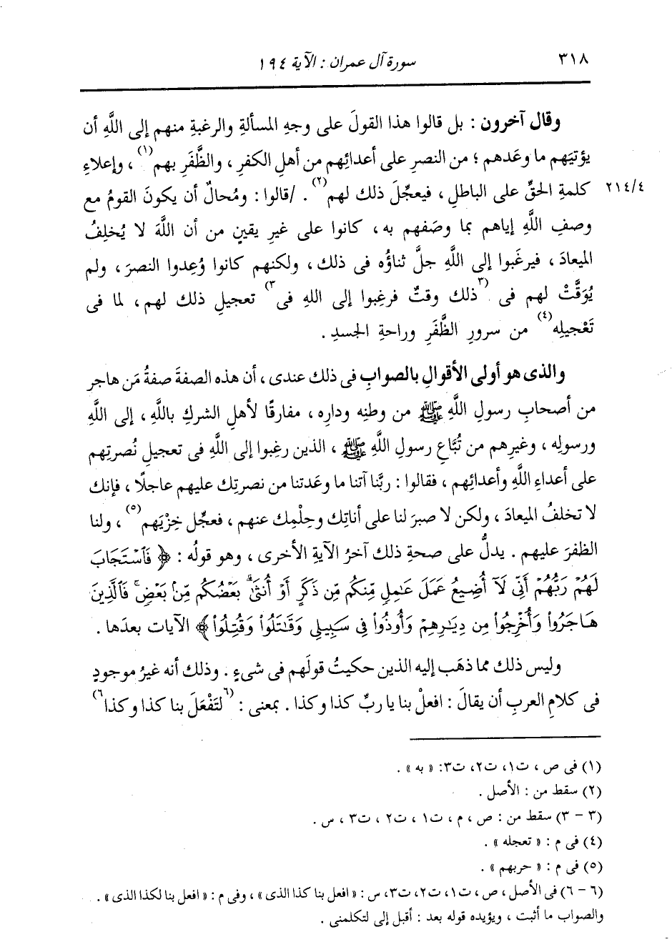 وَقَالَ آخَرُونَ: بَلْ قَالُوا هَذَا الْقَوْلَ عَلَى وَجْهِ الْمَسْأَلَةِ، وَالرَّغْبَةِ مِنْهُمْ إِلَى اللَّهِ أَنْ يُؤْتِيَهُمْ مَا وَعَدَهُمْ مِنَ النَّصْرِ عَلَى أَعْدَائِهِمْ مِنْ أَهْلِ الْكُفْرِ، وَالظَّفَرِ بِهِمْ، وَإِعْلَاءِ كَلِمَةِ الْحَقِّ عَلَى الْبَاطِلِ، فَيُعَجِّلُ ذَلِكَ لَهُمْ، قَالُوا: وَمُحَالٌ أَنْ يَكُونَ الْقَوْمُ مَعَ وَصْفِ اللَّهِ إِيَّاهُمْ بِمَا وَصَفْتُهُمْ بِهِ كَانُوا عَلَى غَيْرِ يَقِينٍ مِنْ أَنَّ اللَّهَ لَا يُخْلِفُ الْمِيعَادَ، فَيَرْغَبُوا إِلَى اللَّهِ جَلَّ ثناؤُهُ فِي ذَلِكَ، وَلَكِنَّهُمْ كَانُوا وُعِدُوا النَّصْرَ، وَلَمْ يُوَقِّتْ لَهُمْ فِي تَعْجِيلِ ذَلِكَ لَهُمْ، لِمَا فِي تَعَجُّلِهِ مِنْ سُرُورِ الظَّفَرِ وَرَاحَةِ الْجَسَدِ. وَالَّذِي هُو أَوْلَى الْأَقْوَالِ بِالصَّوَابِ فِي ذَلِكَ عِنْدِي أَنَّ هَذِهِ الصُّفَّةَ، صِفَةُ مَنْ هَاجَرَ مِنْ أَصْحَابِ رَسُولِ اللَّهِ صَلَّى اللهُ عَلَيْهِ وَسَلَّمَ مِنْ وَطَنِهِ وَدَارِهِ، مُفَارِقًا لِأَهْلِ الشِّرْكِ بِاللَّهِ إِلَى اللَّهِ وَرَسُولِهِ، وَغَيْرِهِمْ مِنْ تُبَّاعِ رَسُولِ اللَّهِ صَلَّى اللهُ عَلَيْهِ وَسَلَّمَ الَّذِينَ رَغِبُوا إِلَى اللَّهِ فِي تَعْجِيلِ نُصْرَتِهِمْ عَلَى أَعْدَاءِ اللَّهِ وَأَعْدَائِهِمْ، فَقَالُوا: رَبَّنَا آتِنَا مَا وَعَدْتَنَا مِنْ نُصْرَتِكَ عَلَيْهِمْ عَاجِلًا، فَإِنَّكَ لَا تَخَلَّفُ الْمِيعَادِ، وَلَكِنْ لَا صَبَرَ لَنَا عَلَى أَنَاتِكَ وَحِلْمِكَ عَنْهُمْ، فَعَجِّلَ حَرْبَهُمْ، وَلَنَا الظَّفَرَ عَلَيْهِمْ، يَدُلُّ عَلَى صِحَّةِ ذَلِكَ آخِرُ الْآيَةِ الْأُخْرَى، وَهُوَ قَوْلُهُ: {فَاسْتَجَابَ لَهُمْ رَبُّهُمْ أَنِّي لَا أُضِيعُ عَمَلَ عَامِلٍ مِنْكُمْ مِنْ ذَكَرٍ أَوْ أُنْثَى بَعْضُكُمْ مِنْ بَعْضٍ فَالَّذِينَ هَاجَرُوا وَأُخْرِجُوا مِنْ دِيَارِهِمْ وَأُوذُوا فِي سَبِيلِي وَقَاتَلُوا وَقُتِلُوا} [آل عمران: 195] . . . الْآيَاتِ بَعْدَهَا، وَلَيْسَ ذَلِكَ مِمَّا ذَهَبَ إِلَيْهِ الَّذِينَ حَكَيْتُ قَوْلَهُمْ فِي شَيْءٍ، وَذَلِكَ أَنَّهُ غَيْرُ مَوْجُودٍ فِي كَلَامِ الْعَرَبِ أَنْ يُقَالَ: افْعَلْ بِنَا يَا رَبُّ كَذَا وَكَذَا،