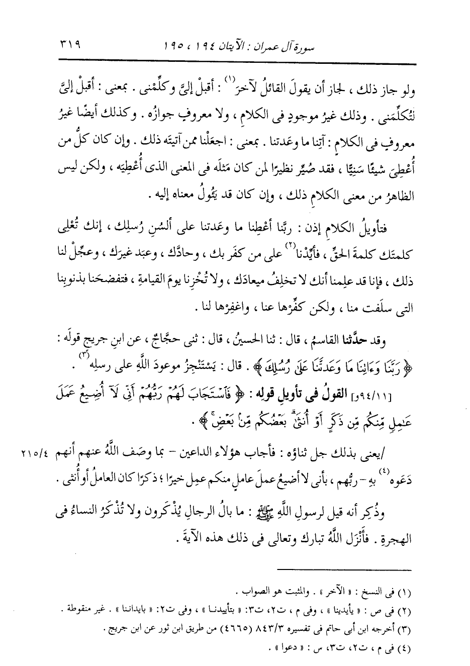 §الْقَوْلُ فِي تَأْوِيلِ قَوْلِهِ تَعَالَى: {فَاسْتَجَابَ لَهُمْ رَبُّهُمْ أَنِّي لَا أُضِيعُ عَمَلَ عَامِلٍ مِنْكُمْ مِنْ ذَكَرٍ أَوْ أُنْثَى بَعْضُكُمْ مِنْ بَعْضٍ فَالَّذِينَ هَاجَرُوا وَأَخْرِجُوا مِنْ دِيَارِهِمْ وَأُوذُوا فِي سَبِيلِي وَقَاتَلُوا وَقُتِلُوا لَأُكَفِّرَنَّ عَنْهُمْ سَيِّئَاتِهِمْ وَلَأُدْخِلَنَّهُمْ جَنَّاتٍ تَجْرِي مِنْ تَحْتِهَا الْأَنْهَارُ ثَوَابًا مِنْ عِنْدِ اللَّهِ وَاللَّهُ عِنْدَهُ حُسْنُ الثَّوَابِ} [آل عمران: 195] يَعْنِي تَعَالَى ذِكْرُهُ: فَأَجَابَ هَؤُلَاءِ الدَّاعِينَ بِمَا وَصَفَ اللَّهُ عَنْهُمْ أَنَّهُمْ دَعَوْا بِهِ رَبَّهُمْ، بِأَنِّي لَا أُضِيعُ عَمَلَ عَامِلٍ مِنْكُمْ عَمِلَ خَيْرًا ذَكَرًا كَانَ الْعَامِلُ أَوْ أُنْثًى، وَذُكِرَ أَنَّهُ قِيلَ لِرَسُولِ اللَّهِ صَلَّى اللهُ عَلَيْهِ وَسَلَّمَ: مَا بَالُ الرِّجَالِ يُذْكَرُونَ وَلَا تُذْكَرُ النِّسَاءُ فِي الْهِجْرَةِ؟ فَأَنْزَلَ اللَّهُ تَبَارَكَ وَتَعَالَى فِي ذَلِكَ هَذِهِ الْآيَةَ