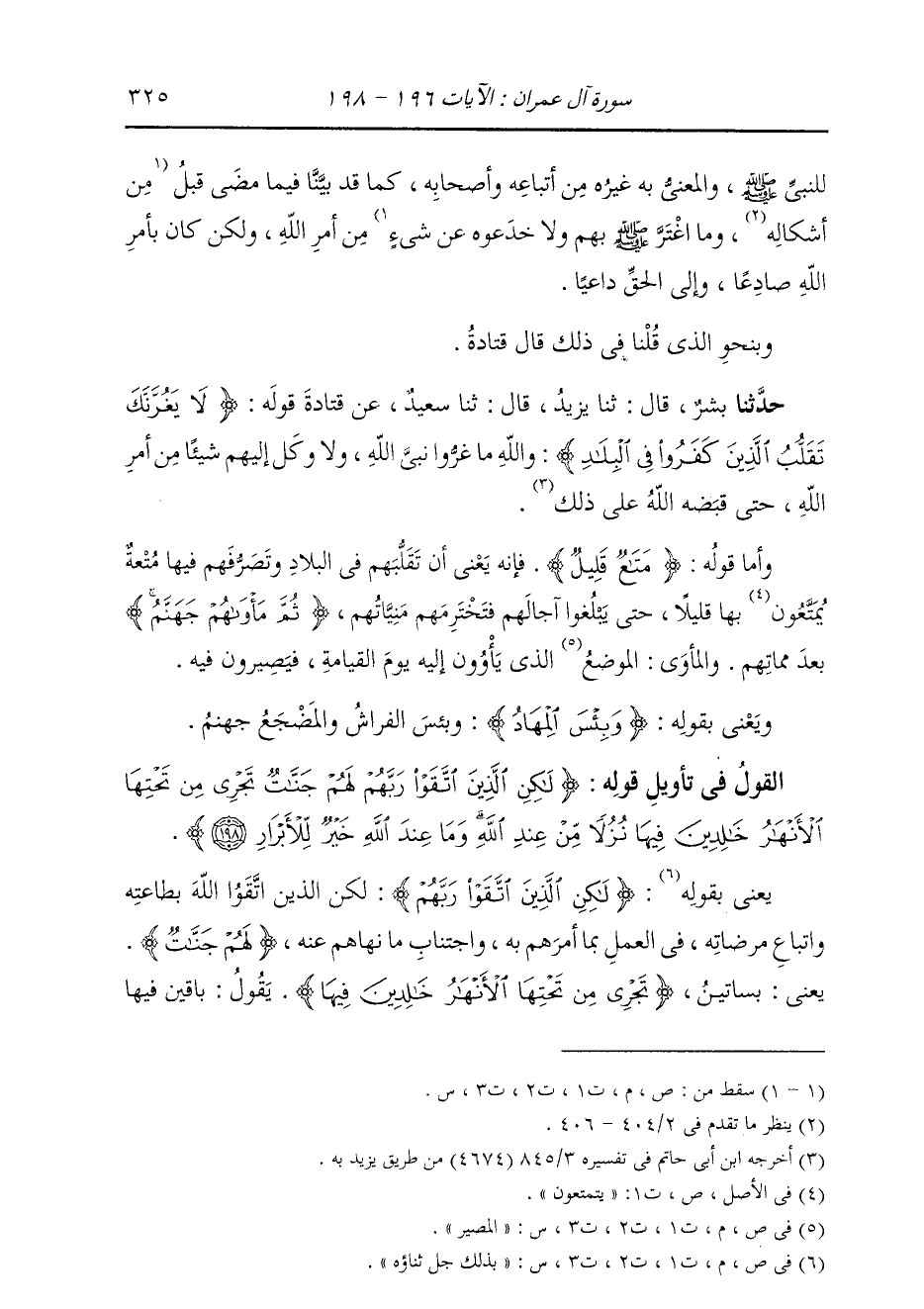 حَدَّثَنَا بِشْرٌ، قَالَ: ثنا يَزِيدُ، قَالَ: ثنا سَعِيدٌ، عَنْ قَتَادَةَ، قَوْلُهُ: {§لَا يَغُرَّنَّكَ تَقَلُّبُ الَّذِينَ كَفَرُوا فِي الْبِلَادِ} [آل عمران: 196] «وَاللَّهُ مَا غَرُّوا نَبِيَّ اللَّهِ، وَلَا وَكَلَ إِلَيْهِمْ شَيْئًا مِنْ أَمْرِ اللَّهِ حَتَّى قَبَضَهُ اللَّهُ عَلَى ذَلِكَ» وَأَمَّا قَوْلُهُ: {مَتَاعٌ قَلِيلٌ} [آل عمران: 197] فَإِنَّهُ يَعْنِي: أَنَّ تَقَلُّبَهُمْ فِي الْبِلَادِ وَتَصَرُّفَهُمْ فِيهَا مُتْعَةٌ يُمَتَّعُونَ بِهَا قَلِيلًا، حَتَّى يَبْلُغُوا آجَالَهُمْ، فَتَخْتَرِمَهُمْ مَنِيَّاتُهُمْ، ثَمَّ مَأْوَاهُمْ جَهَنَّمُ بَعْدَ مَمَاتِهِمْ، وَالْمَأْوَى الْمَصِيرُ الَّذِي يَأْوونَ إِلَيْهِ يَوْمَ الْقِيَامَةِ، فَيَصِيرِونَ فِيهِ، وَيَعْنِي بِقَوْلِهِ: {وَبِئْسَ الْمِهَادُ} [آل عمران: 197] وَبِئْسَ الْفِرَاشُ وَالْمَضْجَعُ جَهَنَّمُ