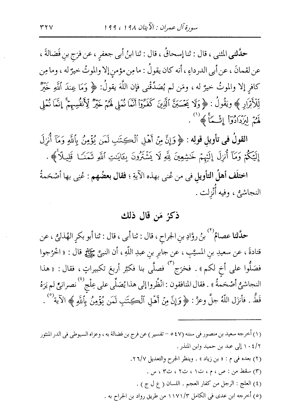 ذِكْرُ مَنْ قَالَ ذَلِكَ: حَدَّثَنَا عِصَامُ بْنُ رَوَّادِ بْنِ الْجَرَّاحِ، قَالَ: ثنا أَبِي، قَالَ: ثنا أَبُو بَكْرٍ الْهُذَلِيُّ، عَنْ قَتَادَةَ، عَنْ سَعِيدِ بْنِ الْمُسَيِّبِ، عَنْ جَابِرِ بْنِ عَبْدِ اللَّهِ، أَنَّ النَّبِيَّ صَلَّى اللهُ عَلَيْهِ وَسَلَّمَ قَالَ: «§اخْرُجُوا فَصَلُّوا عَلَى أَخٍ لَكُمْ» فَصَلَّى بِنَا، فَكَبَّرَ أَرْبَعَ تَكْبِيرَاتٍ، فَقَالَ: «هَذَا النَّجَاشِيُّ أَصْحَمَةُ» ، فَقَالَ الْمُنَافِقُونَ: انْظُرُوا هَذَا يُصَلِّي عَلَى عِلْجٍ نَصْرَانِيٍّ لَمْ يَرَهُ قَطُّ، فَأَنْزَلَ اللَّهُ: {وَإِنَّ مِنْ أَهْلِ الْكِتَابِ لَمَنْ يُؤْمِنُ بِاللَّهِ} [آل عمران: 199]