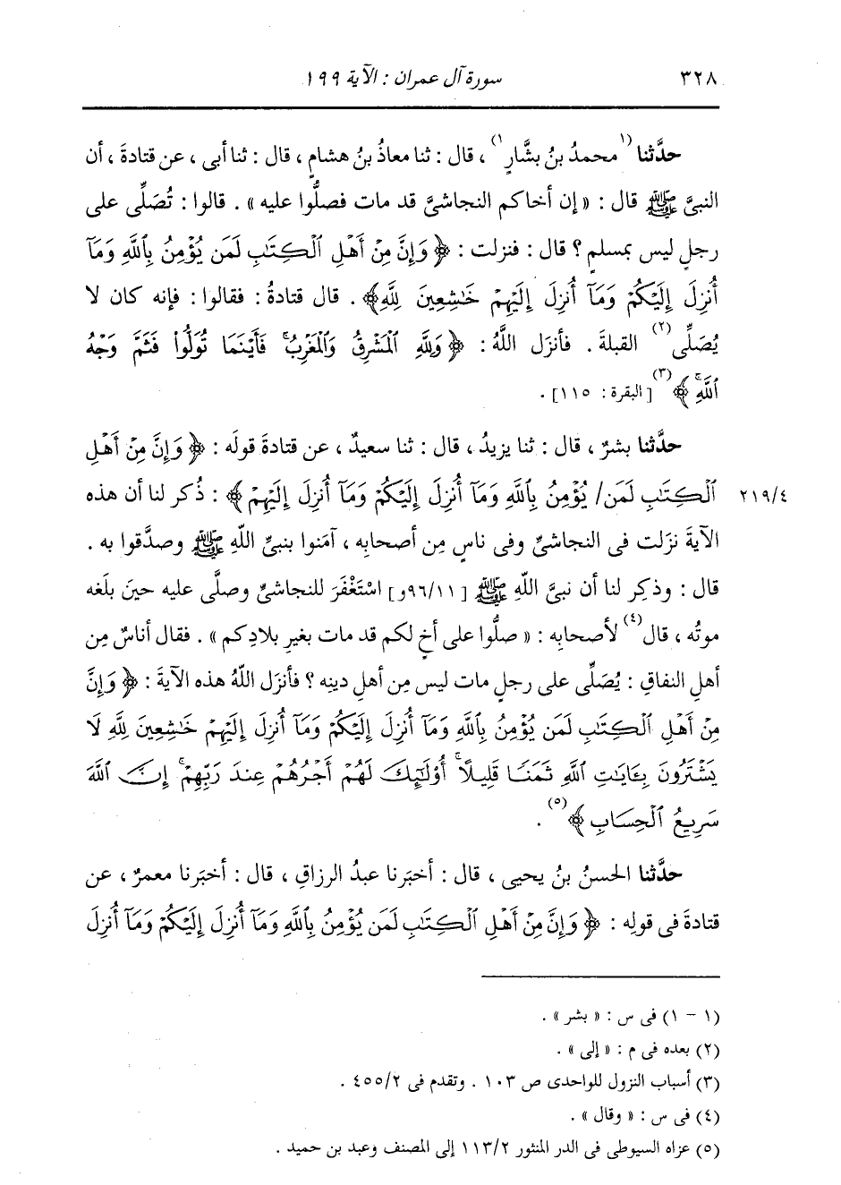 حَدَّثَنَا بِشْرٌ، قَالَ: ثنا يَزِيدُ، قَالَ: ثنا سَعِيدٌ، عَنْ قَتَادَةَ، قَوْلُهُ: {§وَإِنَّ مِنْ أَهْلِ الْكِتَابِ لَمَنْ يُؤْمِنُ بِاللَّهِ وَمَا أُنْزِلَ إِلَيْكُمْ وَمَا أُنْزِلَ إِلَيْهِمْ} [آل عمران: 199] ذُكِرَ لَنَا أَنَّ هَذِهِ الْآيَةَ نَزَلَتْ فِي النَّجَاشِيِّ وَفِي نَاسٍ مِنْ أَصْحَابِهِ آمَنُوا بِنَبِيِّ اللَّهِ صَلَّى اللهُ عَلَيْهِ وَسَلَّمَ، وَصَدَّقُوا بِهِ. قَالَ: وَذُكِرَ لَنَا أَنَّ نَبِيَّ اللَّهِ صَلَّى اللهُ عَلَيْهِ وَسَلَّمَ اسْتَغْفَرَ لِلنَّجَاشِيِّ، وَصَلَّى عَلَيْهِ حِينَ بَلَغَهُ مَوْتُهُ، قَالَ لِأَصْحَابِهِ: «صَلُّوا عَلَى أَخٍ لَكُمْ قَدْ مَاتَ بِغَيْرِ بِلَادِكُمْ» فَقَالَ أُنَاسٌ مِنْ أَهْلِ النِّفَاقِ: يُصَلِّي عَلَى رَجُلٍ مَاتَ لَيْسَ مِنْ أَهْلِ دِينِهِ، فَأَنْزَلَ اللَّهُ هَذِهِ الْآيَةَ: {وَإِنَّ مِنْ أَهْلِ الْكِتَابِ لَمَنْ يُؤْمِنُ بِاللَّهِ وَمَا أُنْزِلَ إِلَيْكُمْ وَمَا أُنْزِلَ إِلَيْهِمْ خَاشِعِينَ لِلَّهِ لَا يَشْتَرُونَ بِآيَاتِ اللَّهِ ثَمَنًا قَلِيلًا أُولَئِكَ لَهُمْ أَجْرُهُمْ عِنْدَ رَبِّهِمْ إِنَّ اللَّهَ سَرِيعُ الْحِسَابِ} [آل عمران: 199]
