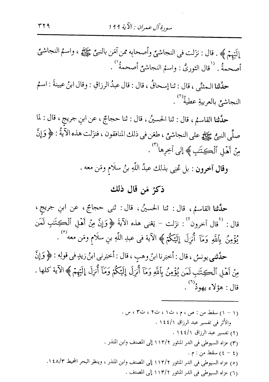 حَدَّثَنَا الْقَاسِمُ، قَالَ: ثنا الْحُسَيْنُ، قَالَ: ثنا حَجَّاجٌ، عَنِ ابْنِ جُرَيْجٍ، قَالَ: «§لَمَّا صَلَّى النَّبِيُّ صَلَّى اللهُ عَلَيْهِ وَسَلَّمَ عَلَى النَّجَاشِيِّ، طَعَنَ فِي ذَلِكَ الْمُنَافِقُونَ» فَنَزَلَتْ هَذِهِ الْآيَةُ: {وَإِنَّ مِنْ أَهْلِ الْكِتَابِ لَمَنْ يُؤْمِنُ بِاللَّهِ} [آل عمران: 199] إِلَى آخِرِ الْآيَةِ " وَقَالَ آخَرُونَ: بَلْ عَنَى بِذَلِكَ عَبْدَ اللَّهِ بْنَ سَلَامٍ وَمَنْ مَعَهِ