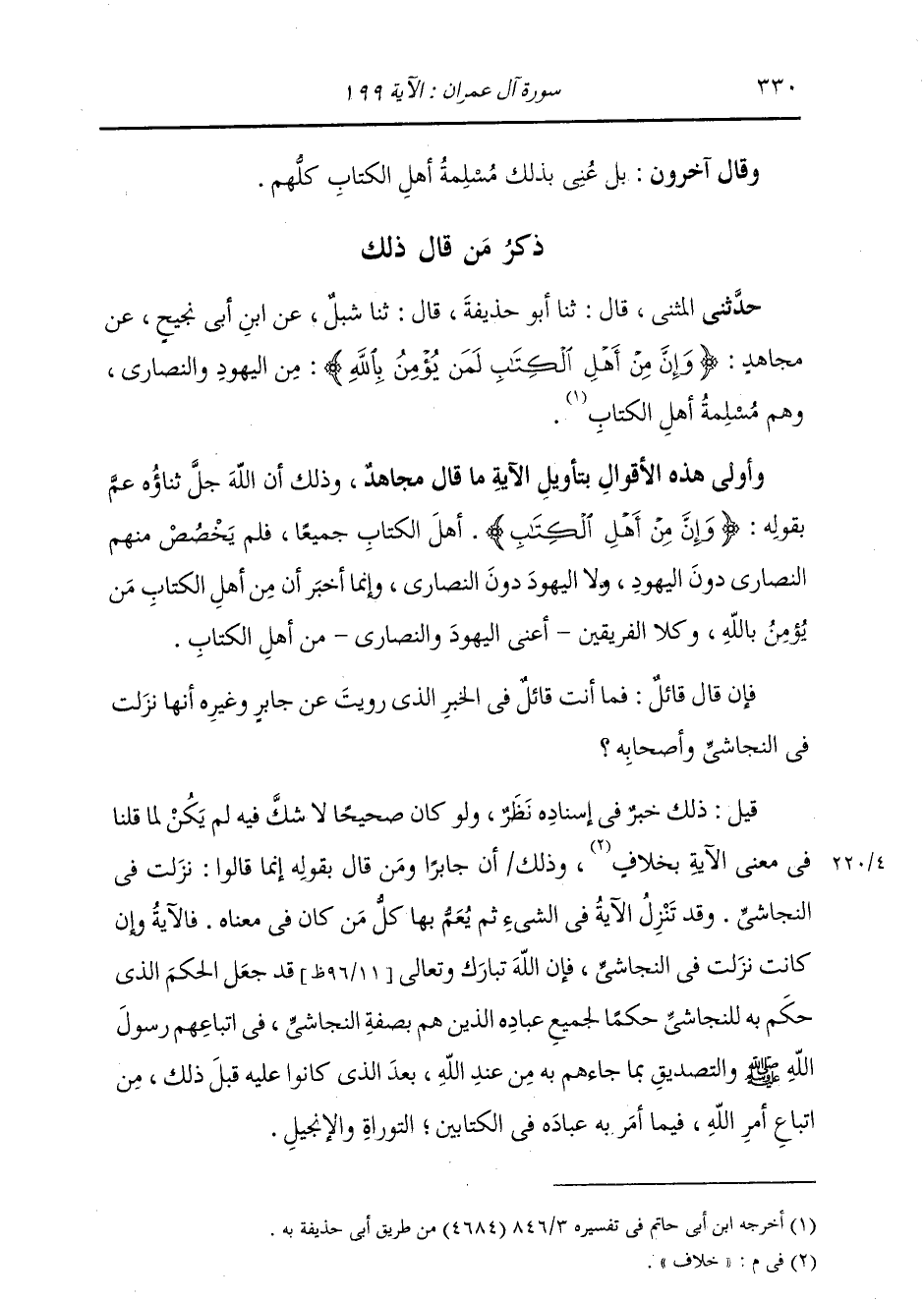 ذِكْرُ مَنْ قَالَ ذَلِكَ: حَدَّثَنِي الْمُثَنَّى، قَالَ: ثنا أَبُو حُذَيْفَةَ، قَالَ: ثنا شِبْلٌ، عَنِ ابْنِ أَبِي نَجِيحٍ، عَنْ مُجَاهِدٍ: {§وَإِنَّ مِنْ أَهْلِ الْكِتَابِ لَمَنْ يُؤْمِنُ بِاللَّهِ وَمَا أُنْزِلَ إِلَيْكُمْ} [آل عمران: 199] «مِنَ الْيَهُودِ وَالنَّصَارَى، وَهُمْ مُسْلِمَةُ أَهْلِ الْكِتَابِ» وَأَوْلَى هَذِهِ الْأَقْوَالِ بِتَأْوِيلِ الْآيَةِ مَا قَالَهُ مُجَاهِدٌ، وَذَلِكَ أَنَّ اللَّهَ جَلَّ ثناؤُهُ عَمَّ بِقَوْلِهِ: {وَإِنَّ مِنْ أَهْلِ الْكِتَابِ} [آل عمران: 199] أَهْلَ الْكِتَابِ جَمِيعًا، فَلَمْ يُخَصِّصْ مِنْهُمُ النَّصَارَى دُونَ الْيَهُودِ، وَلَا الْيَهُودَ دُونَ النَّصَارَى، وَإِنَّمَا أَخْبَرَ أَنَّ مِنْ أَهْلِ الْكِتَابِ مَنْ يُؤْمِنُ بِاللَّهِ، وَكِلَا الْفَرِيقَيْنِ، أَعْنِي الْيَهُودَ وَالنَّصَارَى، مِنْ أَهْلِ الْكِتَابِ. فَإِنْ قَالَ قَائِلٌ: فَمَا أَنْتَ قَائِلٌ فِي الْخَبَرِ الَّذِي رَوَيْتَ عَنْ جَابِرٍ وَغَيْرِهِ أَنَّهَا نَزَلَتْ فِي النَّجَاشِيِّ وَأَصْحَابِهِ؟ قِيلَ: ذَلِكَ خَبَرٌ فِي إِسْنَادِهِ نَظَرٌ، وَلَوْ كَانَ صَحِيحًا لَا شَكَّ فِيهِ لَمْ يَكُنْ لِمَا قُلْنَا فِي مَعْنَى الْآيَةِ بِخِلَافٍ، وَذَلِكَ أَنَّ جَابِرًا وَمَنْ قَالَ بِقَوْلِهِ إِنَّمَا قَالُوا: نَزَلَتْ فِي النَّجَاشِيِّ، وَقَدْ تَنْزِلُ الْآيَةُ فِي الشَّيْءِ ثُمَّ يُعَمُّ بِهَا كُلُّ مَنْ كَانَ فِي مَعْنَاهُ، فَالْآيَةُ وَإِنْ كَانَتْ نَزَلَتْ فِي النَّجَاشِيِّ، فَإِنَّ اللَّهَ تَبَارَكَ وَتَعَالَى قَدْ جَعَلَ الْحُكْمَ الَّذِي حَكَمَ بِهِ لِلنَّجَاشِيِّ حُكْمًا لِجَمِيعِ عِبَادِهِ الَّذِينَ هُمْ بِصِفَةِ النَّجَاشِيِّ فِي اتِّبَاعِهِمْ رَسُولَ اللَّهِ صَلَّى اللهُ عَلَيْهِ وَسَلَّمَ وَالتَّصْدِيقِ بِمَا جَاءَهُمْ بِهِ مِنْ عِنْدِ اللَّهِ، بَعْدَ الَّذِي كَانُوا عَلَيْهِ قَبْلَ ذَلِكَ مِنَ اتِّبَاعِ أَمْرِ اللَّهِ فِيمَا أَمَرَ بِهِ عِبَادَهُ فِي الْكِتَابَيْنِ: التَّوْرَاةِ وَالْإِنْجِيلِ، -[331]- فَإِذْ كَانَ ذَلِكَ كَذَلِكَ، فَتَأْوِيلُ الْآيَةِ: وَإِنَّ مِنْ أَهْلِ الْكِتَابِ التَّوْرَاةِ وَالْإِنْجِيلِ لَمَنْ يُؤْمِنُ بِاللَّهِ، فَيُقِرُّ بِوَحْدَانِيَّتِهِ، وَمَا أُنْزِلَ إِلَيْكُمْ أَيُّهَا الْمُؤْمِنُونَ، يَقُولُ: وَمَا أُنْزِلَ إِلَيْكُمْ مِنْ كِتَابِهِ وَوَحْيِهِ، عَلَى لِسَانِ رَسُولِهِ مُحَمَّدٍ صَلَّى اللهُ عَلَيْهِ وَسَلَّمَ، وَمَا أُنْزِلَ إِلَيْهِمْ، يَعْنِي: وَمَا أُنْزِلَ عَلَى أَهْلِ الْكِتَابِ مِنَ الْكُتُبِ، وَذَلِكَ التَّوْرَاةُ وَالْإِنْجِيلُ وَالزَّبُورُ، خَاشِعِينَ لِلَّهِ، يَعْنِي: خَاضِعِينَ لِلَّهِ بِالطَّاعَةِ، مُسْتَكِينِينَ لَهُ بِهَا مُتَذَلِّلِينَ