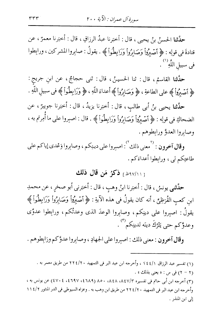 حَدَّثَنَا الْحَسَنُ بْنُ يَحْيَى، قَالَ: أَخْبَرَنَا عَبْدُ الرَّزَّاقِ، قَالَ: أَخْبَرَنَا مَعْمَرٌ، عَنْ قَتَادَةَ، فِي قَوْلِهِ: {§اصْبِرُوا وَصَابِرُوا وَرَابِطُوا} [آل عمران: 200] يَقُولُ: «صَابِرُوا الْمُشْرِكِينَ، وَرَابِطُوا فِي سَبِيلِ اللَّهِ»