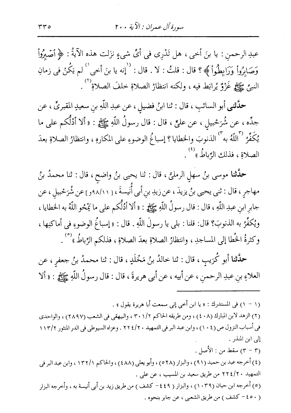 حَدَّثَنَا أَبُو كُرَيْبٍ، قَالَ: ثنا خَالِدُ بْنُ مَخْلَدٍ، قَالَ: ثنا مُحَمَّدُ بْنُ جَعْفَرٍ، عَنِ الْعَلَاءِ بْنِ عَبْدِ الرَّحْمَنِ، عَنْ أَبِيهِ، عَنْ أَبِي هُرَيْرَةَ، قَالَ: قَالَ رَسُولُ اللَّهِ صَلَّى اللهُ عَلَيْهِ وَسَلَّمَ: «أَلَا -[336]- أَدُلُّكُمْ عَلَى §مَا يَحُطُّ اللَّهُ بِهِ الْخَطَايَا وَيَرْفَعُ بِهِ الدَّرَجَاتِ؟» قَالُوا: بَلَى يَا رَسُولَ اللَّهِ. قَالَ: «إِسْبَاغُ الْوضُوءِ عِنْدَ الْمَكَارِهِ، وَكَثْرَةُ الْخُطَا إِلَى الْمَسَاجِدِ، وَانْتِظَارُ الصَّلَاةِ بَعْدَ الصَّلَاةِ، فَذَلِكُمُ الرِّبَاطُ فَذَلِكُمُ الرِّبَاطُ» حَدَّثَنَا الْقَاسِمُ، قَالَ: ثنا الْحُسَيْنُ، قَالَ: ثنا إِسْمَاعِيلُ بْنُ جَعْفَرٍ، عَنِ الْعَلَاءِ بْنِ عَبْدِ الرَّحْمَنِ، عَنْ أَبِيهِ، عَنْ أَبِي هُرَيْرَةَ، عَنِ النَّبِيِّ صَلَّى اللهُ عَلَيْهِ وَسَلَّمَ، بِنَحْوِهِ. وَأَوْلَى التَّأْوِيلَاتِ بِتَأْوِيلِ الْآيَةِ، قَوْلُ مَنْ قَالَ فِي ذَلِكَ: {يَا أَيُّهَا الَّذِينَ آمَنُوا} [آل عمران: 200] يَا أَيُّهَا الَّذِينَ صَدَقُوا اللَّهَ وَرَسُولَهُ، اصْبِرُوا عَلَى دِينِكُمْ، وَطَاعَةِ رَبِّكُمْ، وَذَلِكَ أَنَّ اللَّهَ لَمْ يُخَصِّصْ مِنْ مَعَانِي الصَّبْرِ عَلَى الدِّينِ وَالطَّاعَةِ شَيْئًا فَيَجُوزُ إِخْرَاجُهُ مِنْ ظَاهِرِ التَّنْزِيلِ. فَلِذَلِكَ قُلْنَا إِنَّهُ عَنَى بِقَوْلِهِ: {اصْبِرُوا} [آل عمران: 200] الْأَمْرَ بِالصَّبِرِ عَلَى جَمِيعِ مَعَانِي طَاعَةِ اللَّهِ فِيمَا أَمَرَ وَنَهَى، صَعْبِهَا وَشَدِيدِهَا، وَسَهْلِهَا وَخَفَيفِهَا {وَصَابِرُوا} [آل عمران: 200] يَعْنِي: وَصَابِرُوا أَعْدَاءَكُمْ مِنَ الْمُشْرِكِينَ. وَإِنَّمَا قُلْنَا ذَلِكَ أَوْلَى بِالصَّوَابِ؛ لِأَنَّ الْمَعْرُوفَ مِنْ كَلَامِ الْعَرَبِ فِي الْمُفَاعَلَةِ، أَنْ تَكُونَ مِنْ فَرِيقَيْنِ، أَوِ اثْنَيْنِ فَصَاعِدًا، وَلَا تَكُونَ مِنْ وَاحِدٍ إِلَّا قَلِيلًا فِي أَحْرُفٍ -[337]- مَعْدُودَةٍ، وَإِذْ كَانَ ذَلِكَ كَذَلِكَ، فَإِنَّمَا أُمِرَ الْمُؤْمِنُونَ أَنْ يُصَابِرُوا غَيْرَهُمْ مِنْ أَعْدَائِهِمْ، حَتَّى يُظَفِّرَهُمُ اللَّهُ بِهِمْ، وَيُعْلِي كَلِمَتَهُ، وَيُخْزِي أَعْدَاءَهُمْ، وَأَنْ لَا يَكُونَ عَدُوُّهُمْ أَصْبَرَ مِنْهُمْ. وَكَذَلِكَ قَوْلُهُ {وَرَابِطُوا} [آل عمران: 200] مَعْنَاهُ: وَرَابِطُوا أَعْدَاءَكُمْ وَأَعْدَاءَ دِينِكُمْ مِنْ أَهْلِ الشِّرْكِ فِي سَبِيلِ اللَّهِ. وَأَرَى أَنَّ أَصْلَ الرِّبَاطِ: ارْتِبَاطُ الْخَيْلِ لِلْعَدُوِّ، كَمَا ارْتَبَطَ عَدُوُّهُمْ لَهُمْ خَيْلَهُمْ، ثُمَّ اسْتُعْمِلَ ذَلِكَ فِي كُلِّ مُقِيمٍ فِي ثَغْرٍ، يَدْفَعُ عَمَّنْ وَرَاءَهُ مَنْ أَرَادَهُ مِنْ أَعْدَائِهِمْ بِسُوءٍ، وَيَحْمِي عَنْهُمْ مِنْ بَيْنِهِ وَبَيْنَهُمْ، مِمَّنْ بَغَاهُمْ بِشَرٍّ كَانَ ذَا خَيْلٍ قَدِ ارْتَبَطَهَا، أَوْ ذَا رَجْلَةٍ لَا مَرْكَبَ لَهُ وَإِنَّمَا قُلْنَا: مَعْنَى {وَرَابِطُوا} [آل عمران: 200] وَرَابِطُوا أَعْدَاءَكُمْ وَأَعْدَاءَ دِينِكُمْ؛ لِأَنَّ ذَلِكَ هُوَ الْمَعْنَى الْمَعْرُوفُ مِنْ مَعَانِي الرِّبَاطِ، وَإِنَّمَا تَوَجَّهُ الْكَلَامُ إِلَى الْأَغْلَبِ الْمَعْرُوفِ فِي اسْتِعْمَالِ النَّاسِ مِنْ مَعَانِيهِ دُونَ الْخَفِيِّ، حَتَّى يَأْتِيَ بِخِلَافِ ذَلِكَ مَا يُوجِبُ صَرَفَهُ إِلَى الْخَفِيِّ مِنْ مَعَانِيهِ حُجَّةٌ يَجِبُ التَّسْلِيمُ لَهَا مِنْ كِتَابٍ أَوْ خَبَرٍ عَنِ الرَّسُولِ صَلَّى اللهُ عَلَيْهِ وَسَلَّمَ، أَوْ إِجْمَاعٍ مِنْ أَهْلِ التَّأْوِيلِ