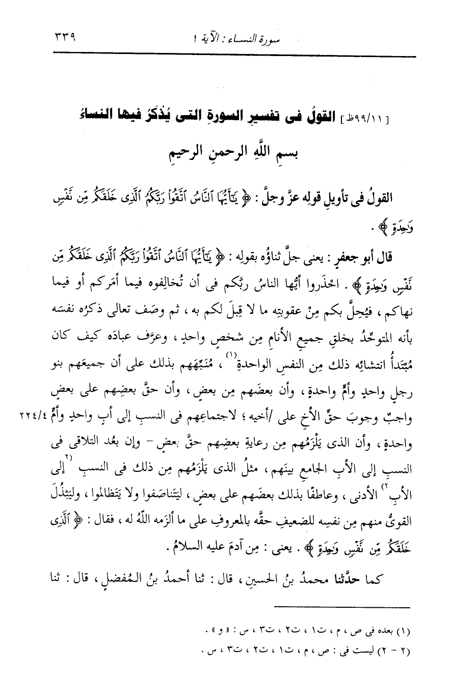 {§يَا أَيُّهَا النَّاسُ اتَّقُوا رَبَّكُمُ الَّذِي خَلَقَكُمْ مِنْ نَفْسٍ وَاحِدَةٍ وَخَلَقَ مِنْهَا زَوْجَهَا وَبَثَّ مِنْهُمَا رِجَالًا كَثِيرًا وَنِسَاءً وَاتَّقُوا اللَّهَ الَّذِي تَسَاءَلُونَ بِهِ وَالْأَرْحَامَ إِنَّ اللَّهَ كَانَ عَلَيْكُمْ رَقِيبًا} [النساء: 1] قَالَ أَبُو جَعْفَرٍ: يَعْنِي بِقَوْلُهُ تَعَالَى ذِكْرُهُ: {يَا أَيُّهَا النَّاسُ اتَّقُوا رَبَّكُمُ الَّذِي خَلَقَكُمْ مِنْ نَفْسٍ وَاحِدَةٍ} [النساء: 1] احْذَرُوا أَيُّهَا النَّاسُ رَبَّكُمْ فِي أَنْ تُخَالِفُوهُ فِيمَا أَمَرَكُمْ، وَفِيمَا نَهَاكُمْ، فَيَحِلَّ بِكُمْ مِنْ عُقُوبَتِهِ مَا لَا قِبَلَ لَكُمْ بِهِ. ثُمَّ وَصَفَ تَعَالَى ذِكْرُهُ نَفْسَهُ بِأَنَّهُ الْمُتَوَحِّدُ بِخَلْقِ جَمِيعِ الْأَنَامِ مِنْ شَخْصٍ وَاحِدٍ، وَعَرَّفَ عِبَادَهُ كَيْفَ كَانَ مُبْتَدَأُ إِنْشَائِهِ ذَلِكَ مِنَ النَّفْسِ الْوَاحِدَةِ، وَمُنَبِّهُهُمْ بِذَلِكَ عَلَى أَنَّ جَمِيعَهُمْ بَنُو رَجُلٍ وَاحِدٍ وَأُمٍّ وَاحِدَةٍ، وَأَنَّ بَعْضَهُمْ مِنْ بَعْضٍ، وَأَنَّ حَقَّ بَعْضِهِمْ عَلَى بَعْضٍ وَاجِبٌ وُجُوبَ حَقِّ الْأَخِ عَلَى أَخِيهِ؛ لِاجْتِمَاعِهِمْ فِي النَّسَبِ إِلَى أَبٍ وَاحِدٍ وَأُمٍّ وَاحِدَةٍ، وَأَنَّ الَّذِي يَلْزَمُهُمْ مِنْ رِعَايَةِ بَعْضِهِمْ حَقَّ بَعْضٍ، وَأَنَّ بَعْدَ التَّلَاقِي فِي النَّسَبِ إِلَى الْأَبِ الْجَامِعِ بَيْنَهُمْ، مِثْلَ الَّذِي يَلْزَمُهُمْ مِنْ ذَلِكَ فِي النَّسَبِ الْأَدْنَى، وَعَاطِفًا بِذَلِكَ بَعْضَهُمْ عَلَى بَعْضٍ، لِيَتَنَاصَفُوا، وَلَا يَتَظَالَمُوا، وَلِيَبْذُلَ الْقَوِيُّ مِنْ نَفْسِهِ لِلضَّعِيفِ حَقَّهُ بِالْمَعْرُوفِ، عَلَى مَا أَلْزَمَهُ اللَّهُ لَهُ، فَقَالَ: {الَّذِي خَلَقَكُمْ مِنْ نَفْسٍ وَاحِدَةٍ} [النساء: 1] يَعْنِي مِنْ آدَمَ