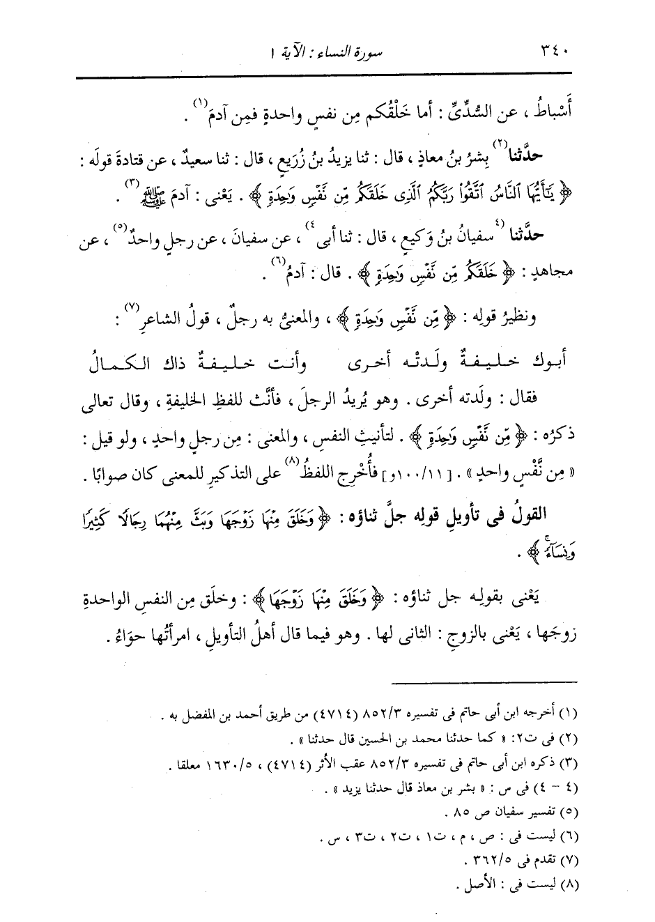 §الْقَوْلُ فِي تَأْوِيلِ قَوْلِهِ تَعَالَى: {وَخَلَقَ مِنْهَا زَوْجَهَا وَبَثَّ مِنْهُمَا رِجَالًا كَثِيرًا وَنِسَاءً} [النساء: 1] يَعْنِي بِقَوْلِهِ جَلَّ ثناؤُهُ: {وَخَلَقَ مِنْهَا زَوْجَهَا} [النساء: 1] وَخَلَقَ مِنَ النَّفْسِ الْوَاحِدَةِ زَوْجَهَا؛ يَعْنِي بِـ «الزَّوْجِ» الثَّانِي لَهَا وَهُوَ فِيمَا قَالَ أَهْلُ التَّأْوِيلِ: امْرَأَتُهَا حَوَّاءُ