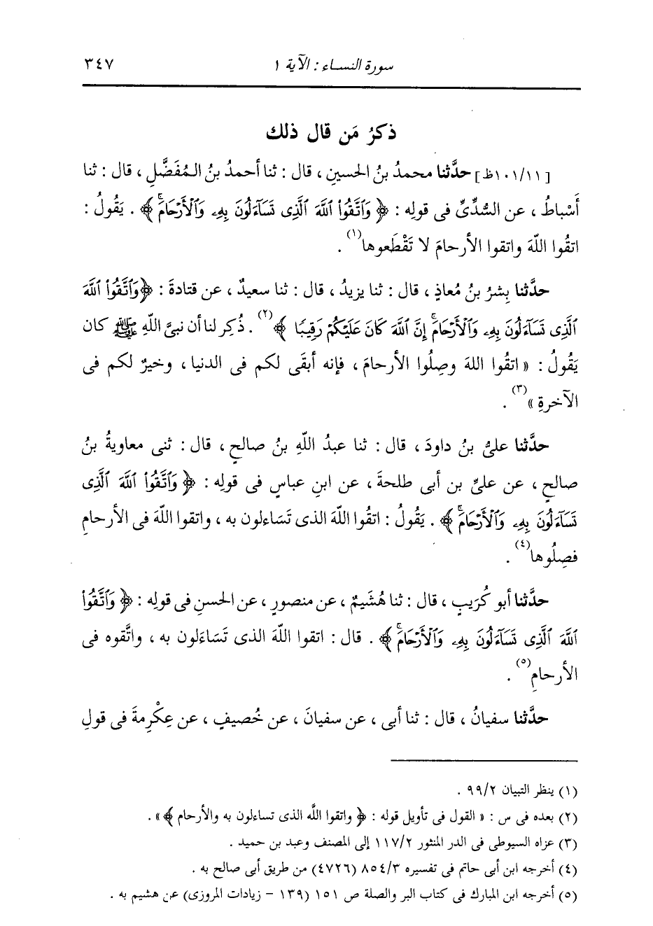 ذِكْرُ مَنْ قَالَ ذَلِكَ: حَدَّثَنَا مُحَمَّدُ بْنُ الْحُسَيْنِ، قَالَ: ثنا أَحْمَدُ بْنُ الْمُفَضَّلِ، قَالَ: ثنا أَسْبَاطٌ، عَنِ السُّدِّيِّ، فِي قَوْلِهِ: {§وَاتَّقُوا اللَّهَ الَّذِي تَسَاءَلُونَ بِهِ وَالْأَرْحَامَ} [النساء: 1] يَقُولُ: «اتَّقُوا اللَّهَ، وَاتَّقُوا الْأَرْحَامَ لَا تَقْطَعُوهَا»
