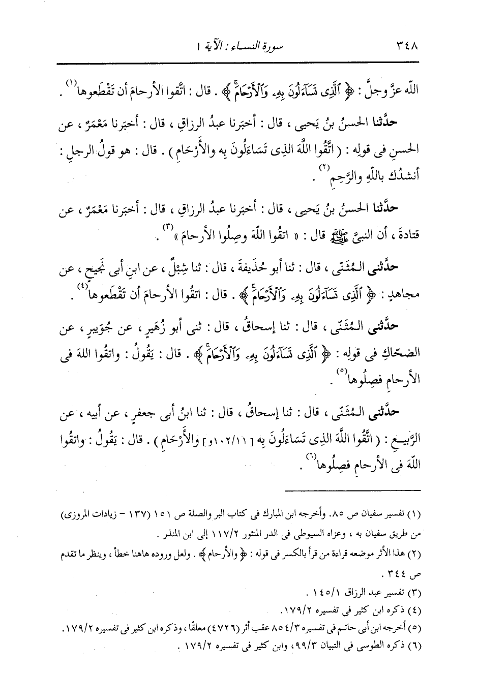 حَدَّثَنِي الْمُثَنَّى، قَالَ: ثنا أَبُو حُذَيْفَةَ، قَالَ: ثنا شِبْلٌ، عَنِ ابْنِ أَبِي نَجِيحٍ، عَنْ مُجَاهِدٍ: {§الَّذِي تَسَاءَلُونَ بِهِ وَالْأَرْحَامَ} [النساء: 1] قَالَ: «اتَّقُوا الْأَرْحَامَ أَنْ تَقْطَعُوهَا»