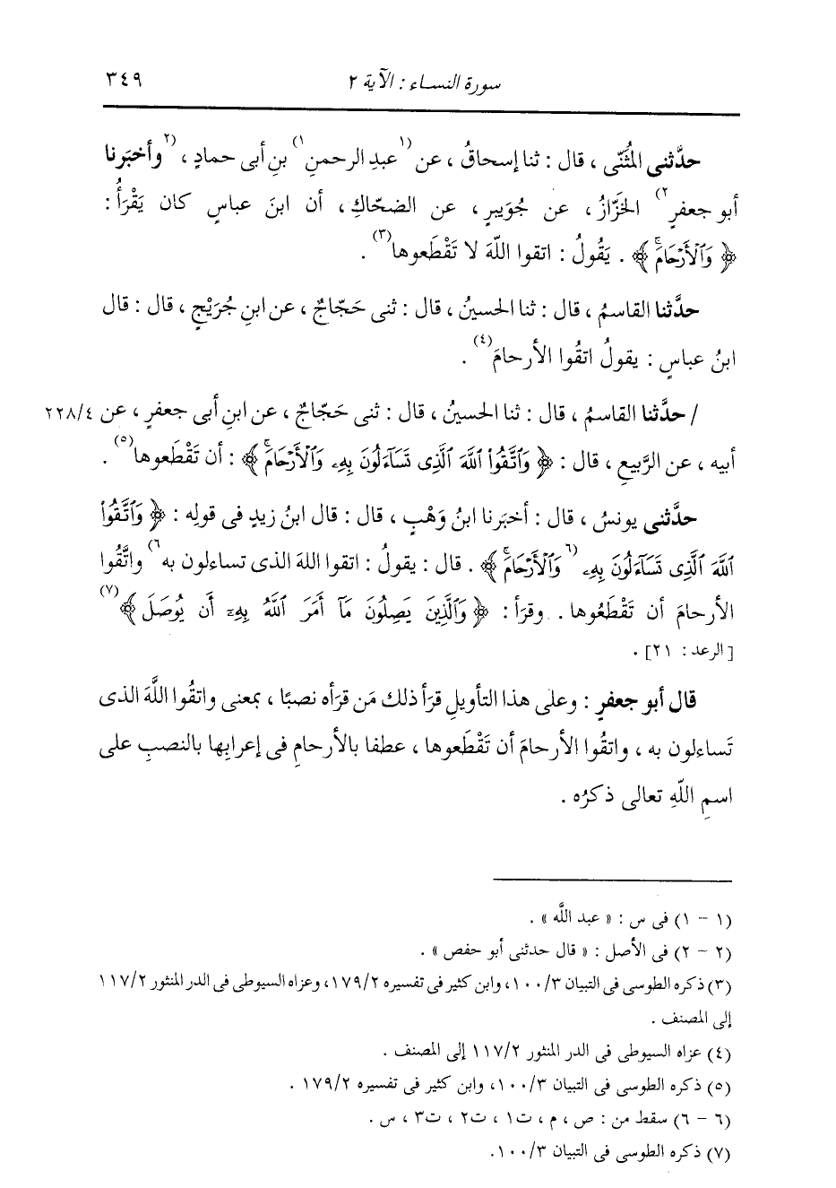 حَدَّثَنِي الْمُثَنَّى، قَالَ: ثنا إِسْحَاقُ، عَنْ عَبْدِ الرَّحْمَنِ بْنِ أَبِي حَمَّادٍ، وَأَخْبَرَنَا أَبُو جَعْفَرٍ الْخَزَّازُ، عَنْ جُوَيْبِرٍ، عَنِ الضَّحَّاكِ، أَنَّ ابْنَ عَبَّاسٍ، كَانَ يَقْرَأُ: {§وَالْأَرْحَامَ} [النساء: 1] يَقُولُ: «اتَّقُوا اللَّهَ لَا تَقْطَعُوهَا»
