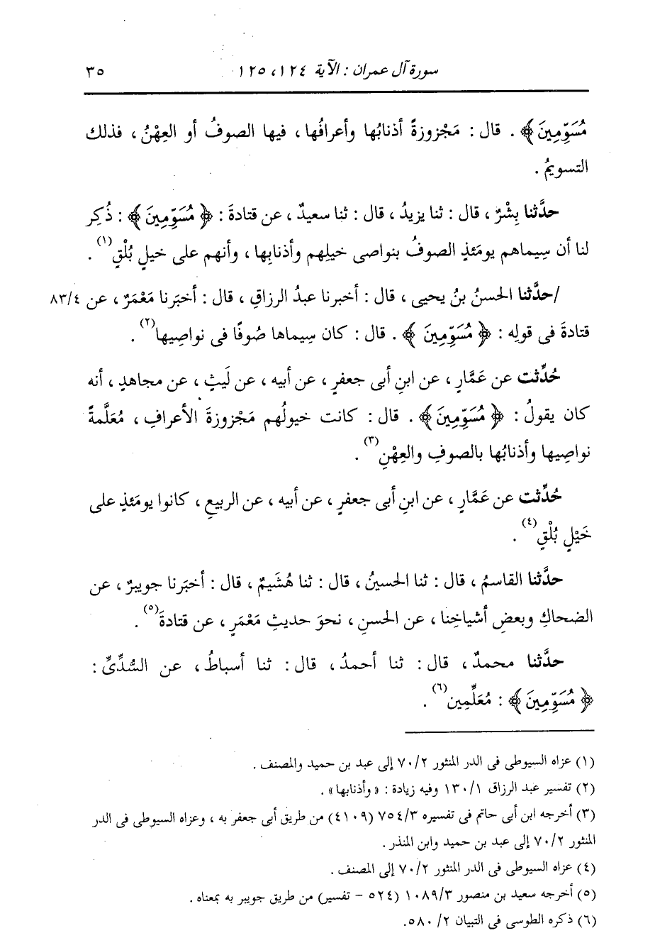 حَدَّثَنَا مُحَمَّدٌ، قَالَ: ثنا أَحْمَدُ، قَالَ: ثنا أَسْبَاطٌ، عَنِ السُّدِّيِّ: {§مُسَوِّمِينَ} [آل عمران: 125] «مُعَلَّمِينَ»