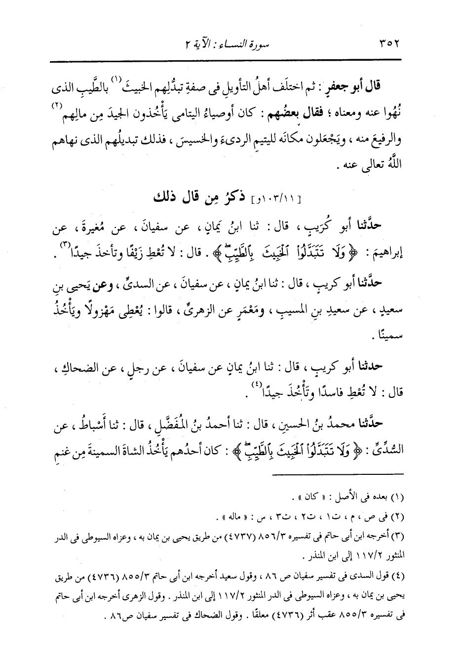 ذِكْرُ مَنْ قَالَ ذَلِكَ: حَدَّثَنَا أَبُو كُرَيْبٍ، قَالَ: ثنا ابْنُ يَمَانٍ، عَنْ سُفْيَانَ، عَنْ مُغِيرَةَ، عَنْ إِبْرَاهِيمَ: {§وَلَا تَتَبَدَّلُوا الْخَبِيثَ بِالطَّيِّبِ} [النساء: 2] قَالَ: «لَا تُعْطِ زَيْفًا وَتَأْخُذْ جَيِّدًا»