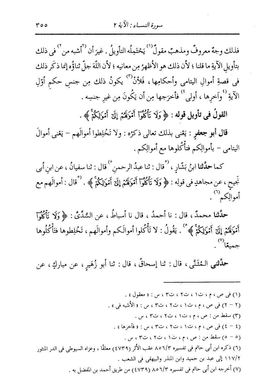 كَمَا: حَدَّثَنَا ابْنُ بَشَّارٍ، قَالَ: ثنا سُفْيَانُ، عَنِ ابْنِ أَبِي نَجِيحٍ، عَنْ مُجَاهِدٍ، فِي قَوْلِهِ: {§وَلَا تَأْكُلُوا أَمْوَالَهُمْ إِلَى أَمْوَالِكُمْ} [النساء: 2] يَقُولُ: «لَا تَأْكُلُوا أَمْوَالَكُمْ وَأَمْوَالَهُمْ، تَخْلِطُوهَا فَتَأْكُلُوهَا جَمِيعًا»