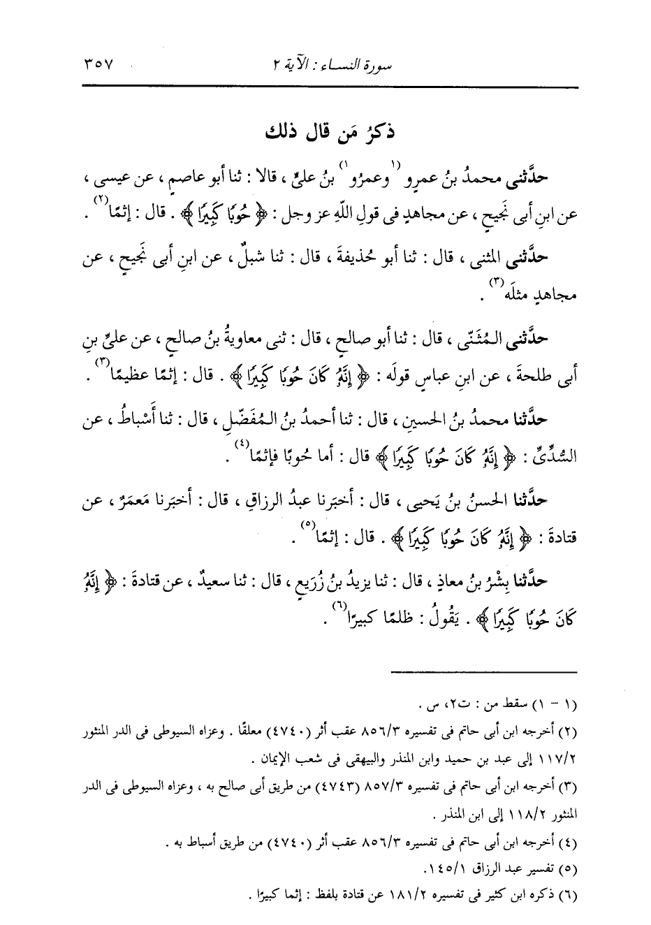 ذِكْرُ مَنْ قَالَ ذَلِكَ: حَدَّثَنِي مُحَمَّدُ بْنُ عَمْرٍو، وَعَمْرُو بْنُ عَلِيٍّ، قَالَا: ثنا أَبُو عَاصِمٍ، عَنْ عِيسَى، عَنِ ابْنِ أَبِي نَجِيحٍ، عَنْ مُجَاهِدٍ، فِي قَوْلِ اللَّهِ: {§حُوبًا كَبِيرًا} [النساء: 2] قَالَ: «إِثْمًا» حَدَّثَنِي الْمُثَنَّى، قَالَ: ثنا أَبُو حُذَيْفَةَ، قَالَ: ثنا شِبْلٌ، عَنِ ابْنِ أَبِي نَجِيحٍ، عَنْ مُجَاهِدٍ مِثْلَهُ