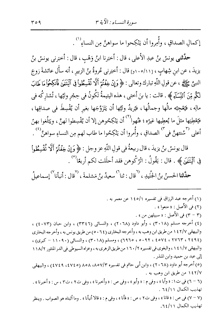 حَدَّثَنَا الْحَسَنُ بْنُ الْجُنَيْدِ، وَأَبُو سَعِيدِ بْنُ مَسْلَمَةَ، قَالَا: أَنْبَأَنَا إِسْمَاعِيلُ -[360]- بْنُ أُمَيَّةَ، عَنِ ابْنِ شِهَابٍ، عَنْ عُرْوَةَ، قَالَ: سَأَلْتُ عَائِشَةَ أُمَّ الْمُؤْمِنِينَ، فَقُلْتُ: يَا أُمَّ الْمُؤْمِنِينَ، أَرَأَيْتِ قَوْلَ اللَّهِ: {§وَإِنْ خِفْتُمْ أَلَّا تُقْسِطُوا فِي الْيَتَامَى فَانْكِحُوا مَا طَابَ لَكُمْ مِنَ النِّسَاءِ} [النساء: 3] ؟ قَالَتْ: «يَا ابْنَ أُخْتِي، هِيَ الْيَتِيمَةُ تَكُونُ فِي حِجْرِ وَلِيِّهَا، فَيَرْغَبُ فِي جَمَالِهَا وَمَالِهَا، وَيُرِيدُ أَنْ يَتَزَوَّجُهَا بِأَدْنَى مِنْ سُنَّةِ صَدَاقِ نِسَائِهَا، فَنُهُوا عَنْ ذَلِكَ أَنْ يَنْكِحُوهُنَّ إِلَّا أَنْ يُقْسِطُوا فَيُكْمِلُوا لَهُنَّ الصَّدَاقَ، ثُمَّ أُمِرُوا أَنْ يَنْكِحُوا سِوَاهُنَّ مِنَ النِّسَاءِ إِنْ لَمْ يُكْمِلُوا لَهُنَّ الصَّدَاقَ» حَدَّثَنِي الْمُثَنَّى، قَالَ: ثنا أَبُو صَالِحٍ، قَالَ: ثني اللَّيْثُ، قَالَ: ثني يُونُسُ، عَنِ ابْنِ شِهَابٍ، قَالَ: ثني عُرْوَةُ بْنُ الزُّبَيْرِ أَنَّهُ سَأَلَ عَائِشَةَ زَوْجَ النَّبِيِّ صَلَّى اللهُ عَلَيْهِ وَسَلَّمَ، فَذَكَرَ مِثْلَ حَدِيثِ يُونُسَ، عَنِ ابْنِ وَهْبٍ. حَدَّثَنَا الْحَسَنُ بْنُ يَحْيَى، قَالَ: أَخْبَرَنَا عَبْدُ الرَّزَّاقِ، قَالَ: أَخْبَرَنَا مَعْمَرٌ، عَنِ الزُّهْرِيِّ، عَنْ عُرْوَةَ، عَنْ عَائِشَةَ مِثْلَ حَدِيثِ ابْنِ حُمَيْدٍ، عَنِ ابْنِ الْمُبَارَكِ