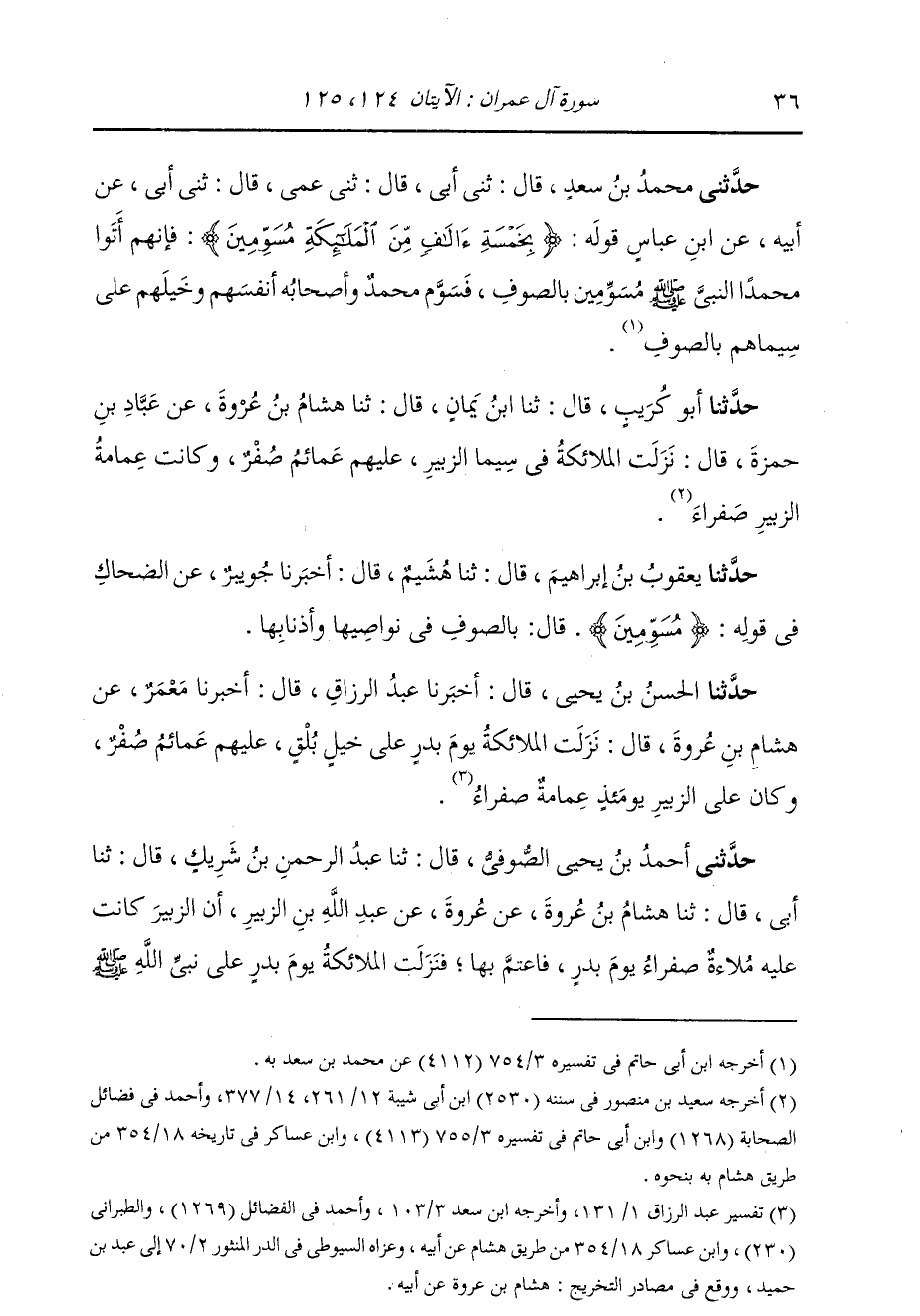 حَدَّثَنِي أَحْمَدُ بْنُ يَحْيَى الصُّوفِيُّ، قَالَ: ثنا عَبْدُ الرَّحْمَنِ بْنُ شَرِيكٍ، قَالَ: ثنا أَبِي، قَالَ: ثنا هِشَامُ بْنُ عُرْوَةَ، عَنْ عُرْوَةَ، عَنْ عَبْدِ اللَّهِ بْنِ الزُّبَيْرِ، «أَنَّ الزُّبَيْرَ، كَانَتْ عَلَيْهِ مَلَاءَةٌ صَفْرَاءُ يَوْمَ بَدْرٍ، فَاعْتَمَّ بِهَا، §فَنَزَلَتِ الْمَلَائِكَةُ يَوْمَ بَدْرٍ عَلَى نَبِيِّ اللَّهِ صَلَّى اللهُ عَلَيْهِ وَسَلَّمَ -[37]- مُعَمَّمِينَ بِعَمَائِمَ صُفْرٍ» فَهَذِهِ الْأَخْبَارُ الَّتِي ذَكَرْنَا بَعْضَهَا عَنْ رَسُولِ اللَّهِ صَلَّى اللهُ عَلَيْهِ وَسَلَّمَ أَنَّهُ قَالَ لِأَصْحَابِهِ: «تَسَوَّمُوا فَإِنَّ الْمَلَائِكَةَ قَدْ تَسَّوَمَتْ» وَقَوْلُ أَبِي أُسَيْدٍ: خَرَجَتِ الْمَلَائِكَةُ فِي عَمَائِمَ صُفْرٍ قَدْ طَرَحُوهَا بَيْنَ أَكْتَافِهِمْ وَقَوْلُ مَنْ قَالَ مِنْهُمْ: {مُسَوِّمِينَ} [آل عمران: 125] مُعَلَّمِينَ يُنْبِئُ جَمِيعَ ذَلِكَ عَنْ صِحَّةِ مَا اخْتَرْنَا مِنَ الْقِرَاءَةِ فِي ذَلِكَ، وَأَنَّ التَّسْوِيمَ كَانَ مِنَ الْمَلَائِكَةِ بِأَنْفُسِهَا، عَلَى نَحْوِ مَا قُلْنَا فِي ذَلِكَ فِيمَا مَضَى