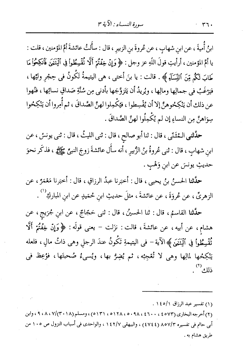 حَدَّثَنَا الْقَاسِمُ، قَالَ: ثنا الْحُسَيْنُ، قَالَ: ثني حَجَّاجٌ، عَنِ ابْنِ جُرَيْجٍ، عَنْ هِشَامٍ، عَنْ أَبِيهِ، عَنْ عَائِشَةَ، قَالَتْ: نَزَلَ، يَعْنِي قَوْلَهُ: {§وَإِنْ خِفْتُمْ أَلَّا تُقْسِطُوا فِي الْيَتَامَى} [النساء: 3] الْآيَةَ، «فِي الْيَتِيمَةِ تَكُونُ عِنْدَ الرَّجُلِ، وَهِيَ ذَاتُ مَالٍ، فَلَعَلَّهُ يَنْكِحُهَا لِمَالِهَا، وَهِيَ لَا تُعْجِبُهُ، ثُمَّ يَضُرُّ بِهَا، وَيُسِيءُ صُحْبَتَهَا، فَوَعَظَ فِي ذَلِكَ» -[361]- قَالَ أَبُو جَعْفَرٍ: فَعَلَى هَذَا التَّأْوِيلِ جَوَابُ قَوْلِهِ: {وَإِنْ خِفْتُمْ أَلَّا تُقْسِطُوا} [النساء: 3] قَوْلُهُ: {فَانْكِحُوا} [النساء: 3] وَقَالَ آخَرُونَ: بَلْ مَعْنَى ذَلِكَ النَّهْي عَنْ نِكَاحِ مَا فَوْقَ الْأَرْبَعِ؛ حَذَرًا عَلَى أَمْوَالِ الْيَتَامَى أَنْ يُتْلِفَهَا أَوْلِيَاؤُهُمْ، وَذَلِكَ أَنَّ قُرَيْشًا كَانَ الرَّجُلُ مِنْهُمْ يَتَزَوَّجُ الْعَشْرَ مِنَ النِّسَاءِ وَالْأَكْثَرَ وَالْأَقَلَّ، فَإِذَا صَارَ مُعْدِمًا مَالَ عَلَى مَالِ يَتِيمِهِ الَّذِي فِي حِجْرِهِ فَأَنْفَقَهُ أَوْ تَزَوَّجَ بِهِ، فَنُهُوا عَنْ ذَلِكَ؛ وَقِيلَ لَهُمْ: إِنْ أَنْتُمْ خِفْتُمْ عَلَى أَمْوَالِ أَيْتَامِكُمْ أَنْ تُنْفِقُوهَا، فَلَا تَعْدِلُوا فِيهَا مِنْ أَجْلِ حَاجَتِكُمْ إِلَيْهَا، لِمَا يَلْزَمُكُمْ مِنْ مُؤَنِ نِسَائِكُمْ، فَلَا تَجَاوِزُوا فِيمَا تَنْكِحُونَ مِنْ عَدَدِ النِّسَاءِ عَلَى أَرْبَعٍ، وَإِنْ خِفْتُمْ أَيْضًا مِنَ الْأَرْبَعِ أَلَّا تَعْدِلُوا فِي أَمْوَالِهِمْ فَاقْتَصِرُوا عَلَى الْوَاحِدَةِ، أَوْ عَلَى مَا مَلَكَتْ أَيْمَانُكُمْ