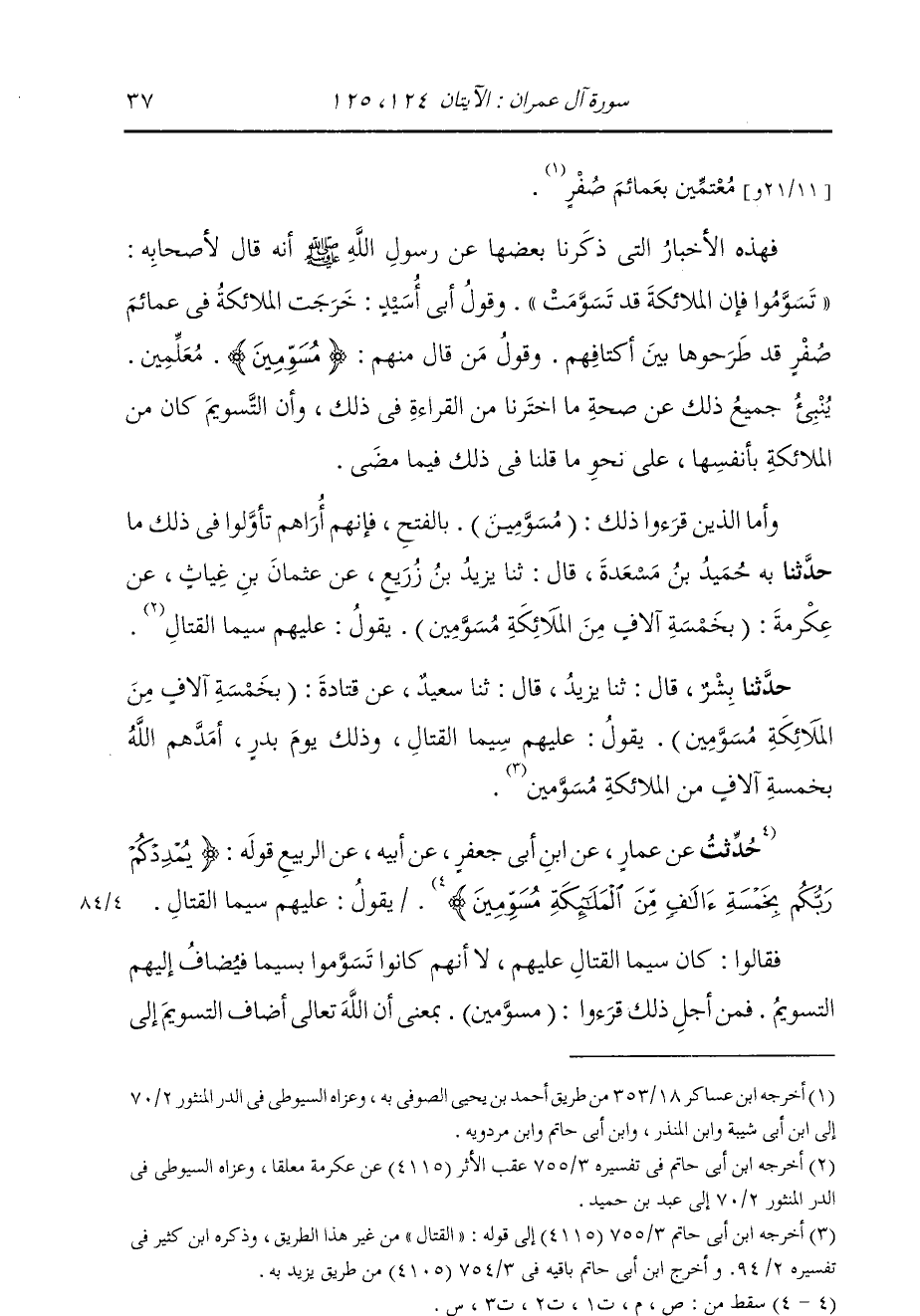 حَدَّثَنَا بِشْرٌ، قَالَ: ثنا يَزِيدُ، قَالَ: ثنا سَعِيدٌ، عَنْ قَتَادَةَ: {§بِخَمْسَةِ آلَافٍ مِنَ الْمَلَائِكَةِ مُسَوِّمِينَ} [آل عمران: 125] ، يَقُولُ: " عَلَيْهِمْ سِيَمَا الْقِتَالِ، وَذَلِكَ يَوْمَ بَدْرٍ، أَمَدَّهُمُ اللَّهُ بِخَمْسَةِ آلَافٍ مِنَ الْمَلَائِكَةِ مُسَوِّمِينَ، يَقُولُ: عَلَيْهِمْ سِيمَا الْقِتَالِ " فَقَالُوا: كَانَ سِيمَا الْقِتَالِ عَلَيْهِمْ، لَا أَنَّهُمْ كَانُوا تَسَوَّمُوا بِسِيمَا فِيُضَافُ إِلَيْهِمُ التَّسْوِيمُ، فَمِنْ أَجْلِ ذَلِكَ قَرَءُوا: {مُسَوِّمِينَ} [آل عمران: 125] بِمَعْنَى أَنَّ اللَّهَ تَعَالَى أَضَافَ التَّسْوِيمَ إِلَى -[38]- مَنْ سَوَّمَهُمْ تِلْكَ السِّيمَا، وَالسِّيمَا الْعَلَامَةُ، يُقَالُ: هِيَ سِيمَا حَسَنَةٌ، وَسِيمِيَاءُ حَسَنَةٌ، كَمَا قَالَ الشَّاعِرُ: