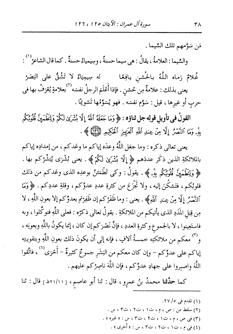 §الْقَوْلُ فِي تَأْوِيلِ قَوْلِهِ تَعَالَى: {وَمَا جَعَلَهُ اللَّهُ إِلَّا بُشْرَى لَكُمْ وَلِتَطْمَئِنَّ قُلُوبُكُمْ بِهِ وَمَا النَّصْرُ إِلَّا مِنْ عِنْدِ اللَّهِ الْعَزِيزِ الْحَكِيمِ} [آل عمران: 126] يَعْنِي تَعَالَى ذِكْرُهُ: وَمَا جَعَلَ اللَّهُ وَعْدَهُ إِيَّاكُمْ مَا وَعَدَكُمْ مِنْ إِمْدَادِهِ إِيَّاكُمْ بِالْمَلَائِكَةِ الَّذِينَ ذَكَرَ عَدَدَهُمْ إِلَّا بُشْرَى لَكُمْ، يَعْنِي بُشْرَى يُبَشِّرُكُمْ بِهَا، {وَلِتَطْمَئِنَّ قُلُوبُكُمْ بِهِ} [آل عمران: 126] يَقُولُ: وَكَيْ تَطْمَئِنَّ بِوَعْدِهِ الَّذِي وَعَدَكُمْ مِنْ ذَلِكَ قُلُوبُكُمْ، فَتَسْكُنُ إِلَيْهِ، وَلَا تَجْزَعُ مِنْ كَثْرَةِ عَدَدِ عَدُوِّكُمْ، وَقِلَّةِ عَدَدِكُمْ. {وَمَا النَّصْرُ إِلَّا مِنْ عِنْدِ اللَّهِ} [آل عمران: 126] يَعْنِي وَمَا ظَفَرُكُمْ إِنْ ظَفِرْتُمْ بِعَدُوِّكُمْ إِلَّا بِعَوْنِ اللَّهِ، لَا مِنْ قِبَلِ الْمَدَدِ الَّذِي يَأْتِيكُمْ مِنَ الْمَلَائِكَةِ، يَقُولُ: فَعَلَى اللَّهِ فَتَوَكَّلُوا، وَبِهِ فَاسْتَعِينُوا، لَا بِالْجُمُوعِ وَكَثْرَةِ الْعَدَدِ، فَإِنَّ نَصْرَكُمْ إِنْ كَانَ إِنَّمَا يَكُونُ بِاللَّهِ وَبِعَوْنِهِ وَمَعَكُمْ مِنْ مَلَائِكَتِهِ خَمْسَةُ آلَافٍ، فَإِنَّهُ إِلَى أَنْ يَكُونَ ذَلِكَ بِعَوْنِ اللَّهِ وَبِتَقْوِيَتِهِ إِيَّاكُمْ عَلَى عَدُوِّكُمْ، وَإِنْ كَانَ مَعَكُمْ مِنَ الْبَشَرِ جُمُوعٌ كَثِيرَةٌ أُخْرَى، فَاتَّقُوا اللَّهَ وَاصْبِرُوا عَلَى جِهَادِهِ عَدُوَّكُمْ، فَإِنَّ اللَّهَ نَاصِرُكُمْ عَلَيْهِمْ