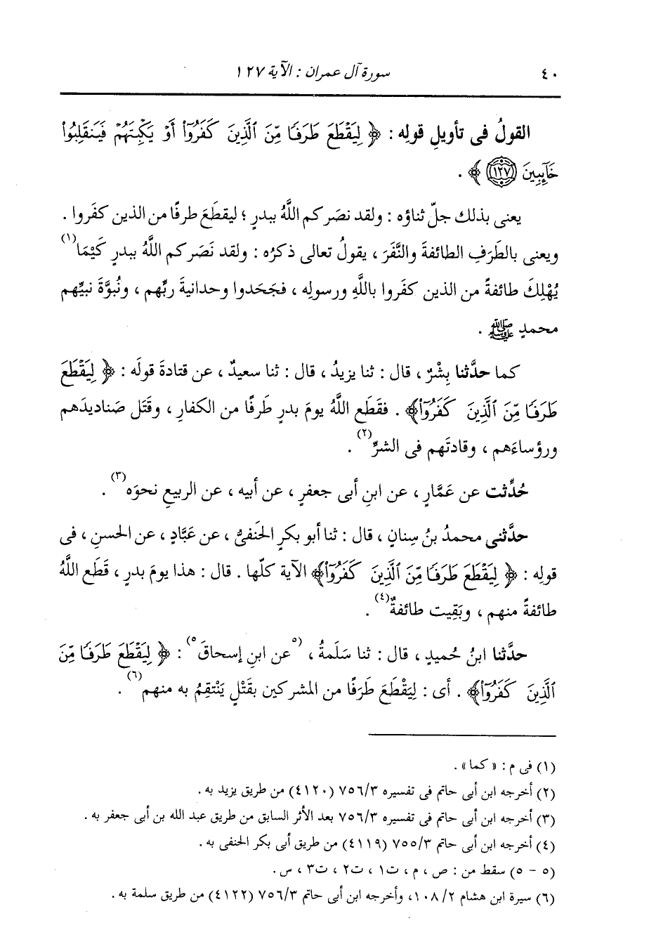 حَدَّثَنَا ابْنُ حُمَيْدٍ، قَالَ: ثنا سَلَمَةُ، عَنِ ابْنِ إِسْحَاقَ: {§لِيَقْطَعَ طَرَفًا مِنَ الَّذِينَ كَفَرُوا} [آل عمران: 127] «أَيْ لِيَقْطَعَ طَرَفًا مِنَ الْمُشْرِكِينَ بِقَتْلٍ يَنْتَقِمُ بِهِ مِنْهُمْ» -[41]- وَقَالَ آخَرُونَ: بَلْ مَعْنَى ذَلِكَ: وَمَا النَّصْرُ إِلَّا مِنْ عِنْدِ اللَّهِ لِيَقْطَعَ طَرَفًا مِنَ الَّذِينَ كَفَرُوا، وَقَالَ: إِنَّمَا عَنَى بِذَلِكَ مَنْ قُتِلَ بِأُحُدٍ