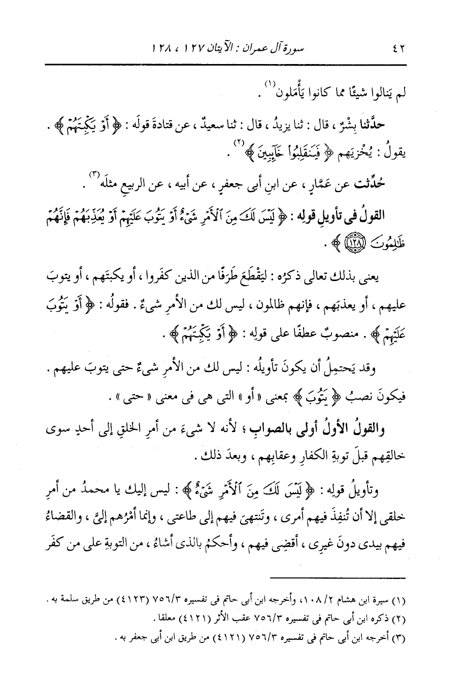 §الْقَوْلُ فِي تَأْوِيلِ قَوْلِهِ تَعَالَى: {لَيْسَ لَكَ مِنَ الْأَمْرِ شَيْءٌ أَوْ يَتُوبَ عَلَيْهِمْ أَوْ يُعَذِّبَهُمْ فَإِنَّهُمْ ظَالِمُونَ} [آل عمران: 128] يَعْنِي بِذَلِكَ تَعَالَى ذِكْرُهُ: لِيَقْطَعَ طَرَفًا مِنَ الَّذِينَ كَفَرُوا أَوْ يَكْبِتَهُمْ، أَوْ يَتُوبَ عَلَيْهِمْ، أَوْ يُعَذِّبَهُمْ، فَإِنَّهُمْ ظَالِمُونَ، لَيْسَ لَكَ مِنَ الْأَمْرِ شَيْءٌ، فَقَوْلُهُ: {أَوْ يَتُوبَ عَلَيْهِمْ} [آل عمران: 128] مَنْصُوبٌ عَطْفًا عَلَى قَوْلِهِ: {أَوْ يَكْبِتَهُمْ} [آل عمران: 127] وَقَدْ يُحْتَمَلُ أَنْ يَكُونَ تَأْوِيلُهُ: لَيْسَ لَكَ مِنَ الْأَمْرِ شَيْءٌ حَتَّى يَتُوبَ عَلَيْهِمْ، فَيَكُونُ نَصَبَ «يَتُوبَ» بِمَعْنَى «أَوْ» الَّتِي هِيَ فِي مَعْنَى «حَتَّى» وَالْقَوْلُ الْأَوَّلُ أَوْلَى بِالصَّوَابِ؛ لِأَنَّهُ لَا شَيْءَ مِنْ أَمَرِ الْخَلْقِ إِلَى أَحَدٍ سِوَى خَالِقِهِمْ قَبْلَ تَوْبَةِ الْكُفَّارِ وَعِقَابِهِمْ وَبَعْدَ ذَلِكَ، وَتَأْوِيلُ قَوْلِهِ: {لَيْسَ لَكَ مِنَ الْأَمْرِ شَيْءٌ} [آل عمران: 128] لَيْسَ إِلَيْكَ يَا مُحَمَّدُ مِنْ أَمْرِ خَلْقِي إِلَّا أَنْ تُنَفِّذَ فِيهِمْ أَمْرِي، وَتَنْتَهِي فِيهِمْ إِلَى طَاعَتِي، وَإِنَّمَا أَمْرُهُمْ إِلَيَّ وَالْقَضَاءُ فِيهِمْ بِيَدِي دُونَ غَيْرِي أَقْضِي فِيهِمْ، وَأَحْكُمُ بِالَّذِي أَشَاءُ مِنَ التَّوْبَةِ عَلَى مَنْ كَفَرَ